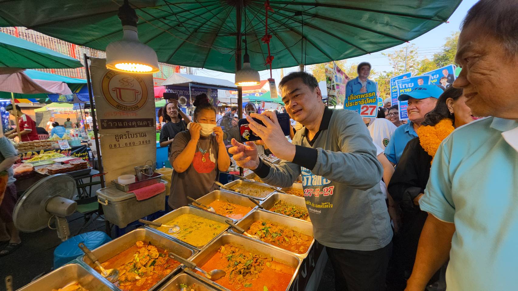 "อภิสิทธิ์" สวมเสื้อปุ๋ยสูตร 27-27-27 ใช้แล้วประเทศไทยโตไว เดินสายขอคะแนนเสียงจากแม่ค้าพ่อค้าตลาดสดหน้าสถานีรถไฟจังหวัดพิษณุโลก