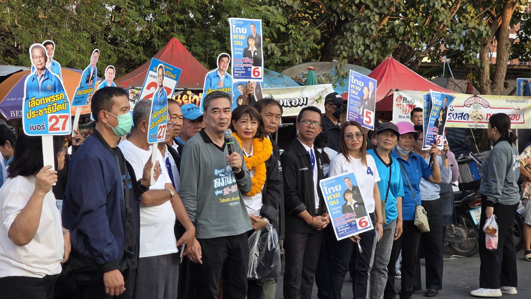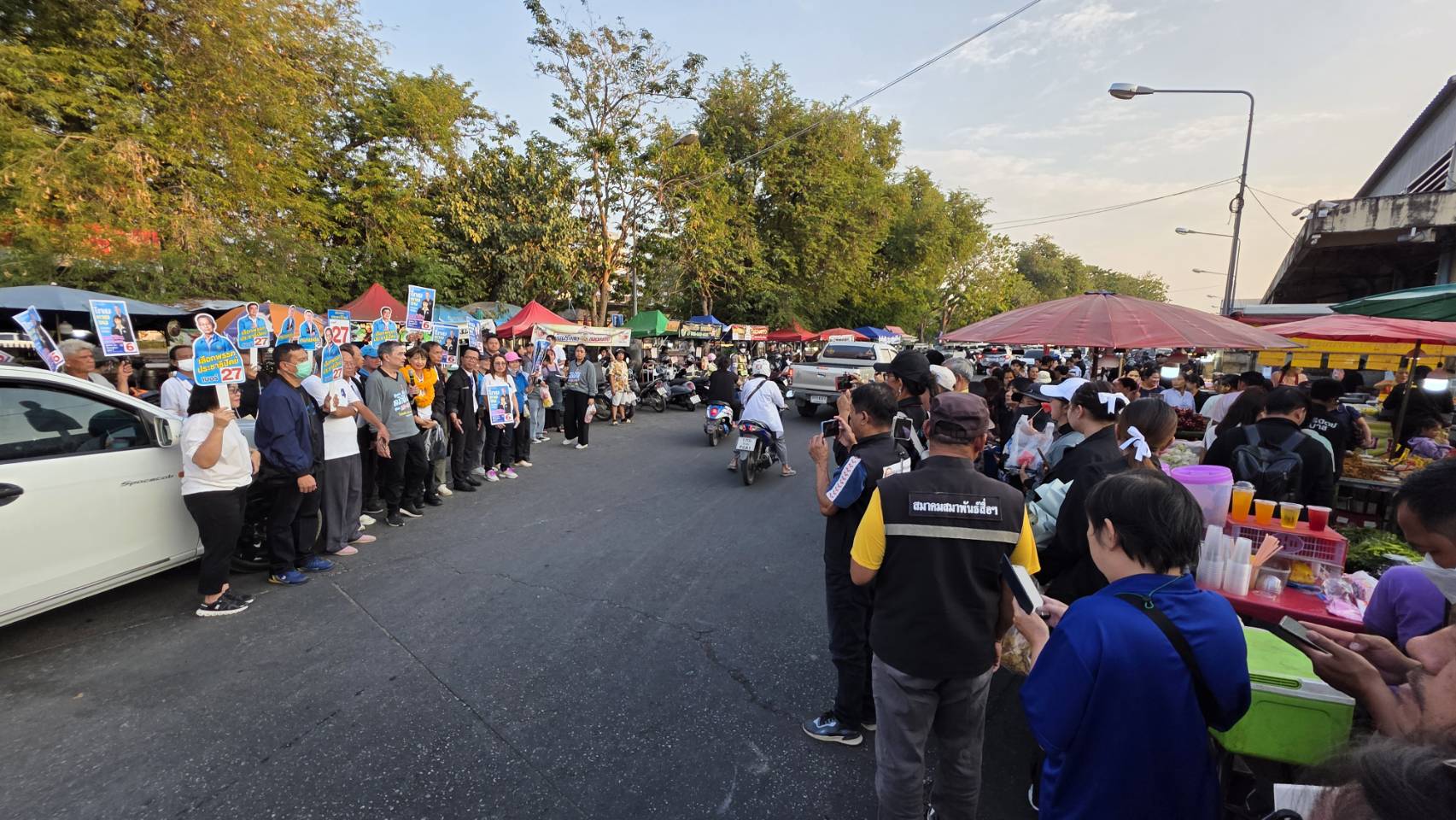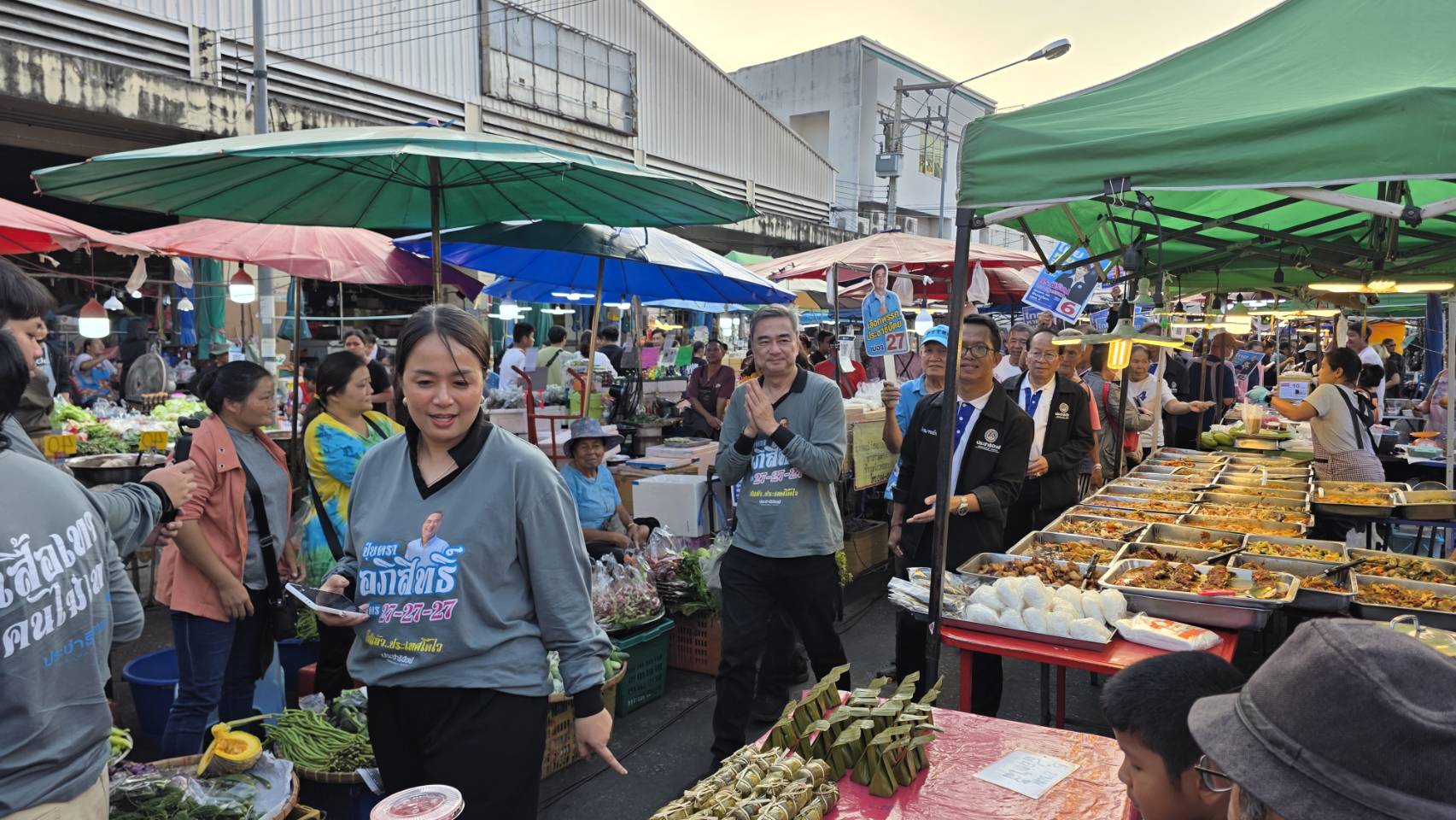 "อภิสิทธิ์" สวมเสื้อปุ๋ยสูตร 27-27-27 ใช้แล้วประเทศไทยโตไว เดินสายขอคะแนนเสียงจากแม่ค้าพ่อค้าตลาดสดหน้าสถานีรถไฟจังหวัดพิษณุโลก