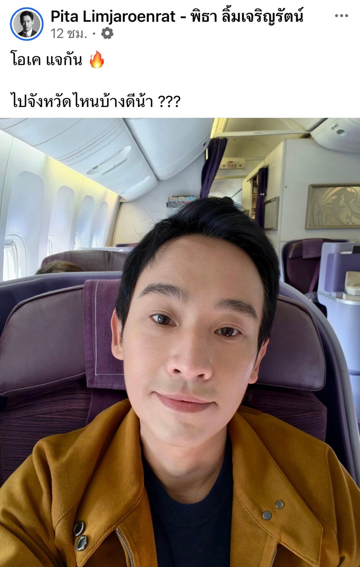 24 มกราคม 2569 - นายพิธา ลิ้มเจริญรัตน์ อดีตหัวหน้าพรรคก้าวไกล โพสต์เฟซบุ๊ก ขณะกำลังนั่งเครื่องบินกลับประเทศไทย พร้อมระบุสั้นๆ ว่า “โอเค เจอกัน พร้อมอิโมจิไฟลุก ไปจังหวัดไหนบ้างดีน้า ???”