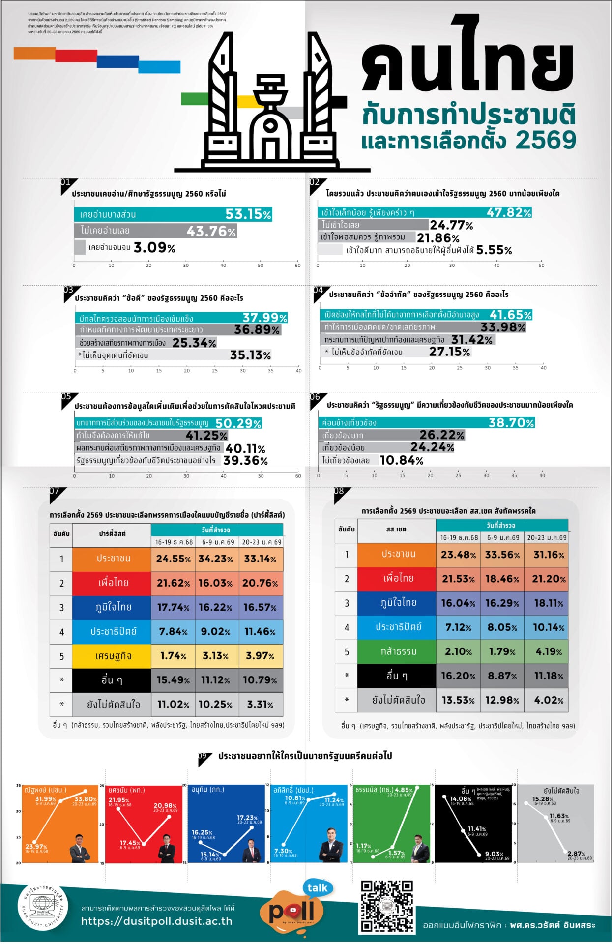25 ม.ค. 2569 – “สวนดุสิตโพล” มหาวิทยาลัยสวนดุสิต สำรวจความคิดเห็นประชาชนทั่วประเทศ เรื่อง “คนไทยกับการทำประชามติและการเลือกตั้ง 2569” กลุ่มตัวอย่าง จำนวน 2,269 คน (สำรวจทางออนไลน์และภาคสนาม) ระหว่างวันที่ 20-23 มกราคม 2569 ในประเด็นเกี่ยวกับการทำประชามติ พบว่า กลุ่มตัวอย่างร้อยละ 53.15 เคยอ่าน/ศึกษารัฐธรรมนูญ 2560 บางส่วน โดยรวมคิดว่าตนเองเข้าใจรัฐธรรมนูญ 2560 เล็กน้อย ร้อยละ 47.82 มองว่าข้อดี คือ มีกลไกตรวจสอบนักการเมืองเข้มแข็ง ร้อยละ 37.99 ข้อจำกัด คือ เปิดช่องให้กลไกที่ไม่ได้มาจากการเลือกตั้งมีอำนาจสูง ร้อยละ 41.65 ข้อมูลเพิ่มเติมที่ต้องการรู้เพื่อช่วยในการตัดสินใจโหวตประชามติ คือ บทบาทการมีส่วนร่วมของประชาชนในรัฐธรรมนูญ ร้อยละ 50.29 ทั้งนี้มองว่ารัฐธรรมนูญค่อนข้างเกี่ยวข้องกับชีวิตของประชาชน ร้อยละ 38.70