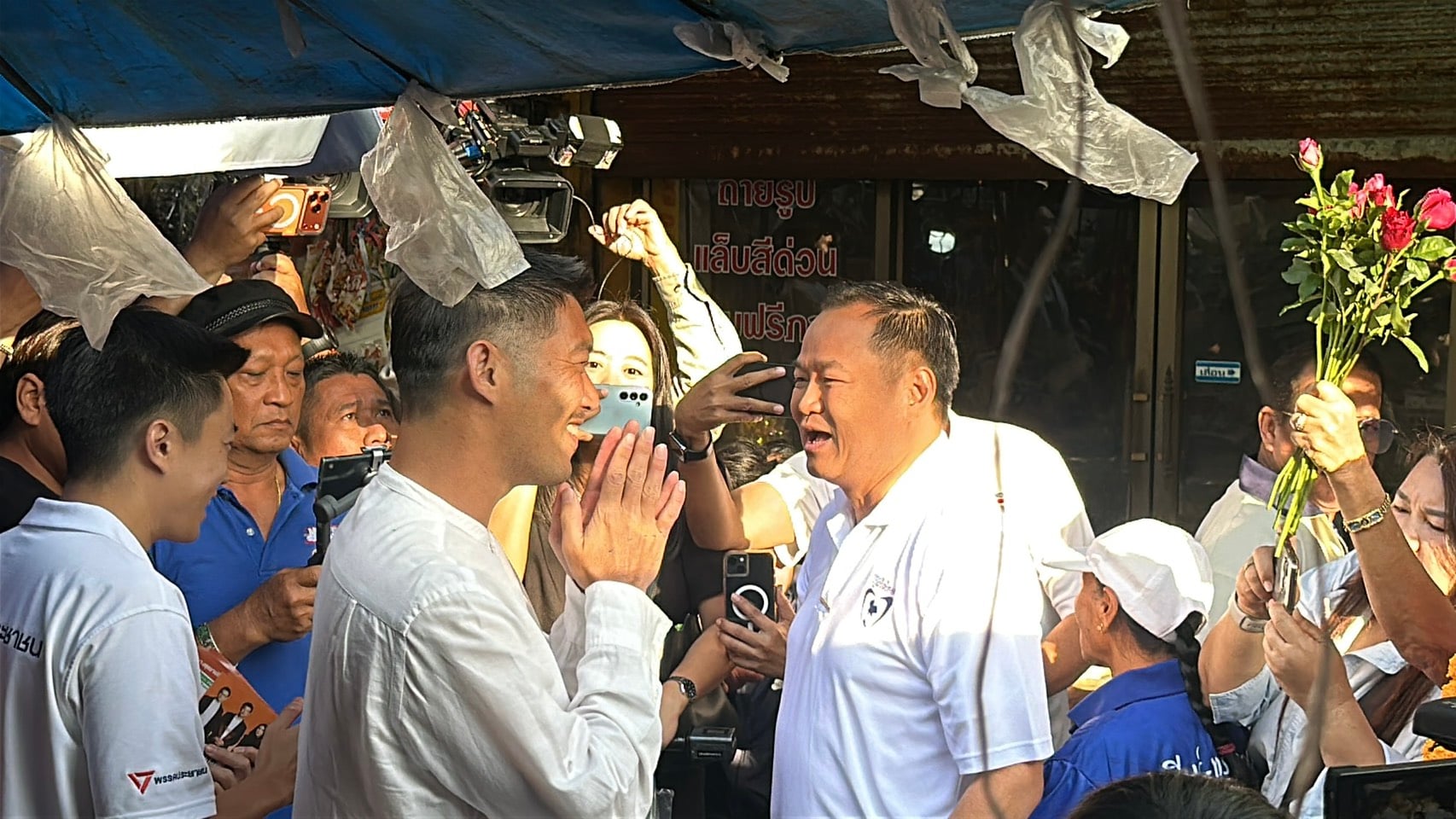 อย่างไรก็ตาม ระหว่างนายอนุทิน และคณะได้เดินมายังจุดกลางตลาด ได้พบกับนายธนาธร จึงรุ่งเรืองกิจ ผู้ช่วยหาเสียงพรรคประชาชน และผู้สมัคร สส.พระนครศรีอยุธยาของพรรคประชาชน โดยนายอนุทินได้โบกมือทักทายก่อนที่จะเดินมาจับมือกัน ซึ่งนายธนาธรได้ยกมือไหว้ในอนุทินพร้อมกับกล่าวว่า “พี่ไปทางโน้นใช่ไหม ผมจะได้ไปทางนี้ นายอนุทินจึงบอกว่า “เสียงจะได้ไม่ตีกัน” พร้อมทักทาย นายทวิวงศ์ โตทาวิวงษ์ อดีต สส.พระนครศรีอยุธยา พรรคประชาชนว่า “เคยเจอกัน” จากนั้นจึงแยกกันไปในหาเสียงในตลาดต่อ