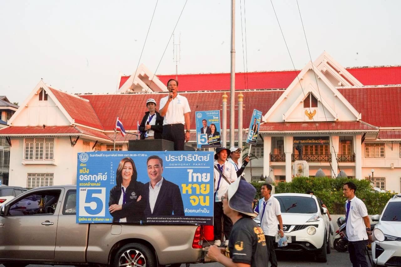 นายอภิสิทธิ์ เวชชาชีวะ หัวหน้าพรรคประชาธิปัตย์ พร้อมด้วยนายกรณ์ จาติกวณิช ดร.การดี เลียวไพโรจน์ 3 แคนดิเดตนายกรัฐมนตรีของพรรคประชาธิปัตย์ เบอร์ 27 และนางสาวศิริภา อินทวิเชียร ผู้สมัคร สส.เขต 6 พญาไท ดินแดง เบอร์ 5 ลงพื้นที่พบปะพี่น้องประชาชนตลาดนัดหลังกระทรวงการคลัง