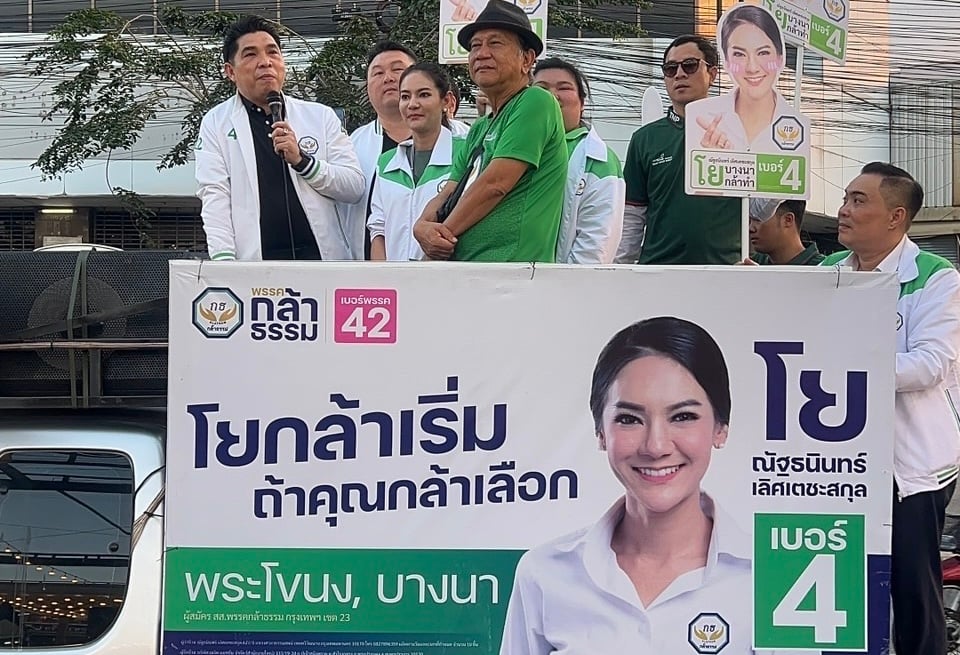 6 กุมภาพันธ์ 2569 - บรรยากาศการหาเสียงเลือกตั้งในเขตพระโขนง-บางนาเริ่มคึกคักในช่วงโค้งสุดท้ายก่อนวันเลือกตั้ง 8 กุมภาพันธ์ 2569 โดย น.ส.ณัฐธนินทร์ หรือ “โย” เลิศเตชะสกุล ผู้สมัคร สส. เขตพระโขนง–บางนา เบอร์ 4 พรรคกล้าธรรม หมายเลขพรรค 42 ลงพื้นที่พบประชาชน ขอคะแนนเสียงจากชุมชนและย่านการค้าในพื้นที่อย่างต่อเนื่อง