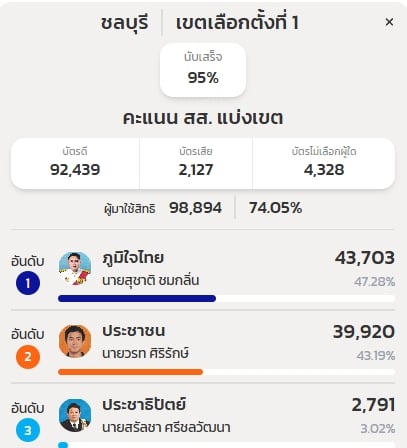 สำหรับผลคะแนนของ ชลบุรี เขต 1 จากรายงานของ กกต.