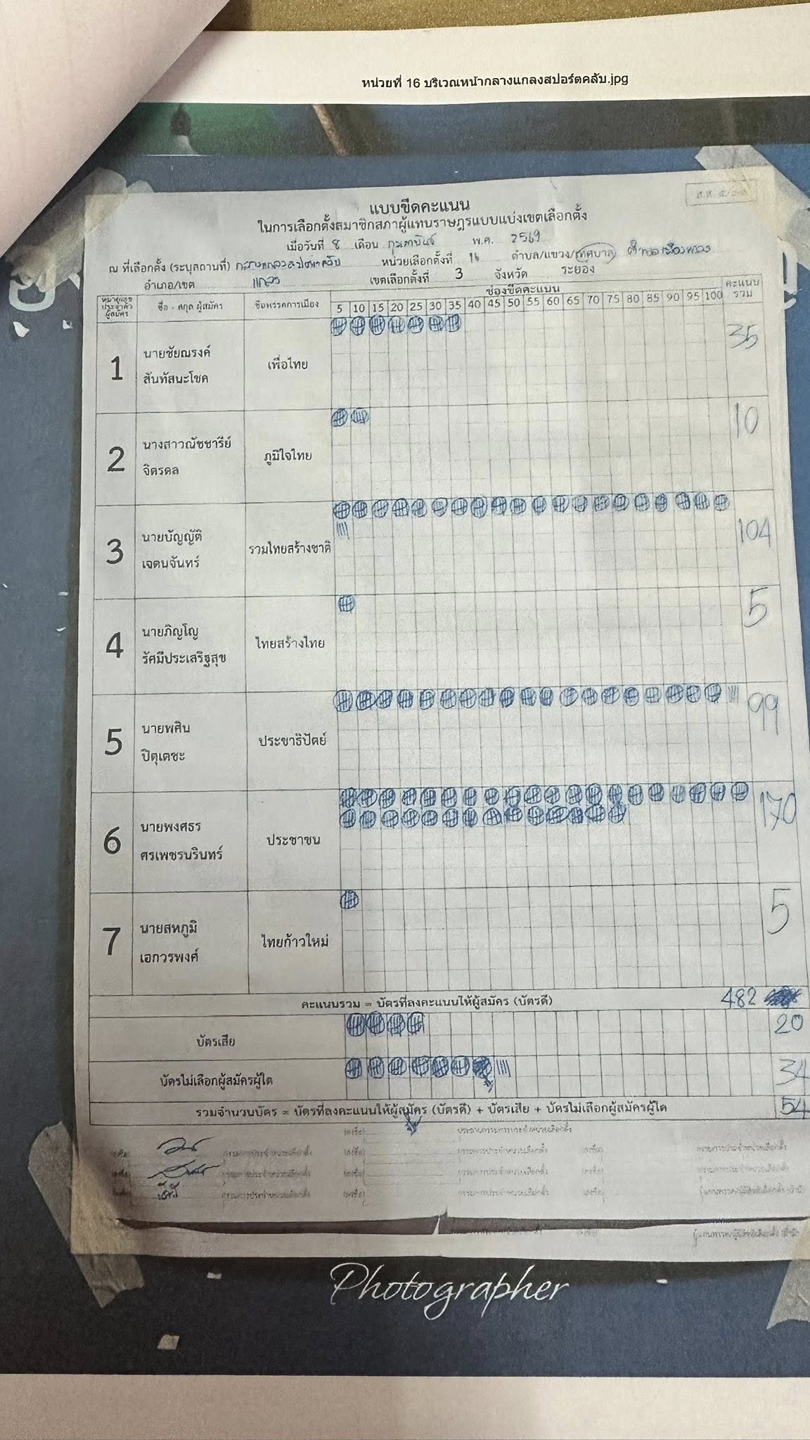 คะแนนที่ปรากฎในใบขีดคะแนน สส 5/11 ที่อาสาสมัครถ่ายมาจากหน้าหน่วยในวันนับคะแนน