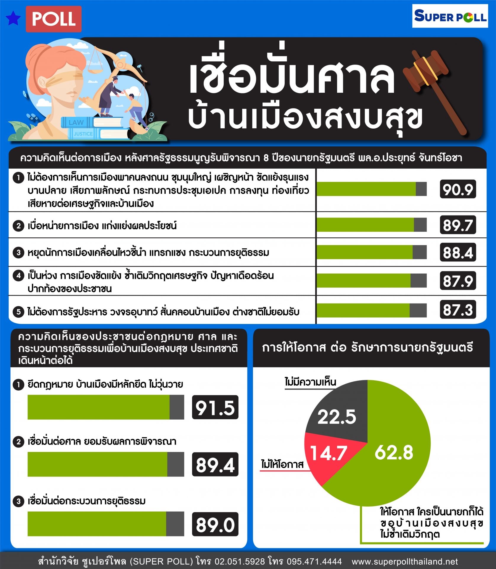 เมื่อถามถึงความคิดเห็นของประชาชนต่อ การเมือง หลังศาลรัฐธรรมนูญรับพิจารณา 8 ปีของนายกรัฐมนตรี พล.อ.ประยุทธ์ จันทร์โอชา พบว่า ส่วนใหญ่หรือร้อยละ 90.9 ระบุ ไม่ต้องการเห็นการเมืองพาคนลงถนน ชุมนุมใหญ่ เผชิญหน้า ขัดแย้งรุนแรงบานปลาย เสียภาพลักษณ์ กระทบการประชุมเอเปค การลงทุน ท่องเที่ยว เสียหายต่อเศรษฐกิจและบ้านเมือง รองลงมาคือ ร้อยละ 89.7 ระบุ เบื่อหน่ายการเมือง แก่งแย่งผลประโยชน์ ร้อยละ 88.4 หยุดนักการเมืองเคลื่อนไหวชี้นำ แทรกแซง กระบวนการยุติธรรม ร้อยละ 87.9 เป็นห่วง การเมืองขัดแย้ง ซ้ำเติมวิกฤตเศรษฐกิจ ปัญหาเดือดร้อน ปากท้องของประชาชน ร้อยละ 87.3 ไม่ต้องการรัฐประหาร วงจรอุบาทว์ สั่นคลอนบ้านเมือง ต่างชาติไม่ยอมรับ