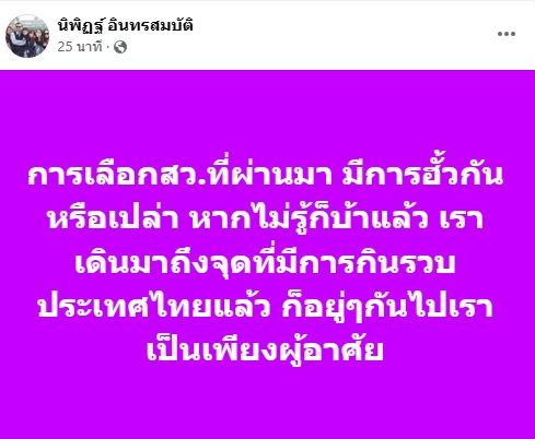 25 ก.พ.2558- นายนิพิฏฐ์ อินทรสมบัติ อดีตส.ส.พัทลุง โพสต์ข้อความว่า การเลือกสว.ที่ผ่านมา มีการฮั้วกันหรือเปล่า หากไม่รู้ก็บ้าแล้ว เราเดินมาถึงจุดที่มีการกินรวบประเทศไทยแล้ว ก็อยู่ๆกันไปเราเป็นเพียงผู้อาศัย