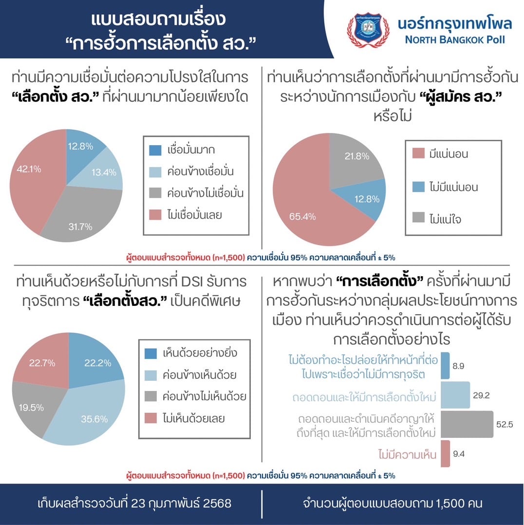 27 ก.พ.2568 - ผศ.ดร.สานิต ศิริวิศิษฐ์กุล หัวหน้าศูนย์สำรวจความคิดเห็น นอร์ทกรุงเทพโพล เปิดเผยว่า เมื่อวันที่ 23 กุมภาพันธ์ 2568 ได้ทำการสำรวจจากประชาชนจำนวน 1,500 ราย จากทั่วภูมิภาค ถึงประเด็น "การฮั้วการเลือกตั้งสมาชิกวุฒิสภา(สว.)"