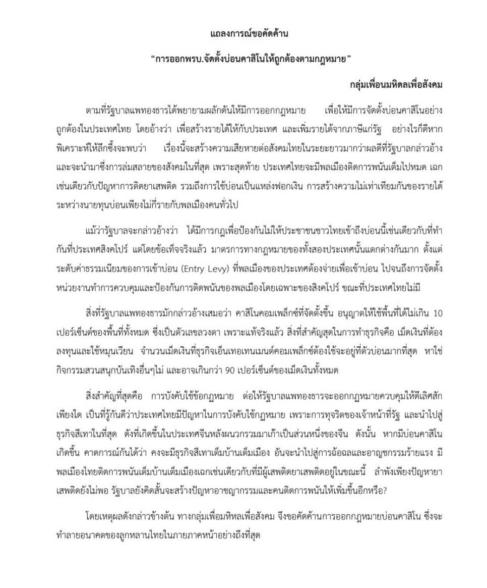 โดยเหตุผลดังกล่าวข้างต้น ทางกลุ่มเพื่อนมหิดลเพื่อสังคม จึงขอคัดค้านการออกกฎหมายบ่อนคาสิโน ซึ่งจะทำลายอนาคตของลูกหลานไทยในภายภาคหน้าอย่างถึงที่สุด
