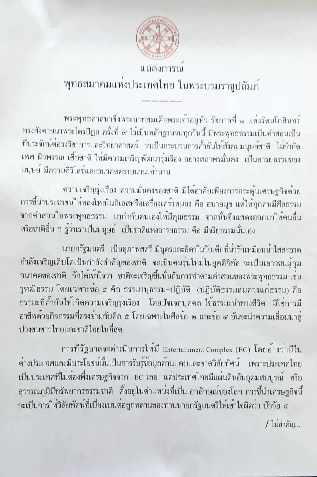 แถลงการณ์ชี้ว่า การอ้างว่าเอ็นเตอร์เทนเมนต์คอมเพล็กซ์ จะกระตุ้นเศรษฐกิจเป็น “ข้ออ้างที่ขัดต่อพุทธธรรม” เพราะความเจริญแท้ไม่ได้วัดจากเม็ดเงิน หากแต่เป็น การเจริญทางปัญญา คุณธรรม และการไม่พึ่งอบายมุข