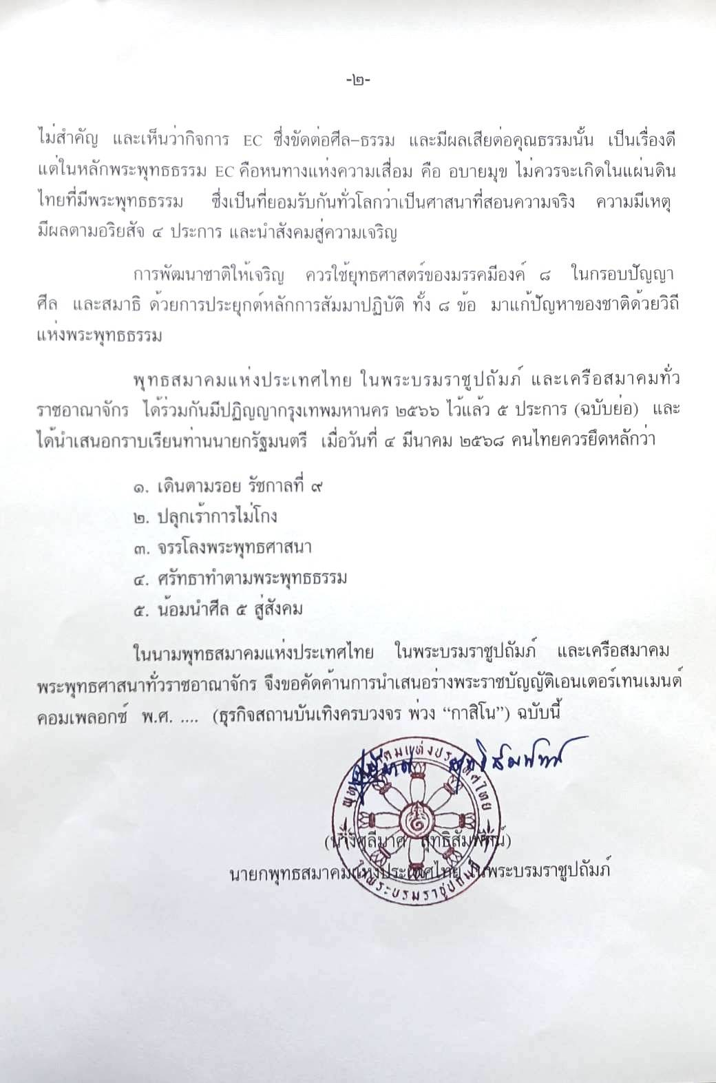 ทั้งนี้พุทธสมาคมฯ ประกาศจุดยืนชัดเจน คัดค้านทุกความพยายามในการผลักดันให้มีกาสิโนในนามพระราชบัญญัติ Entertainment Complex พร้อมระบุว่าคนไทยควรยึดหลัก 5 ข้อ ได้แก่