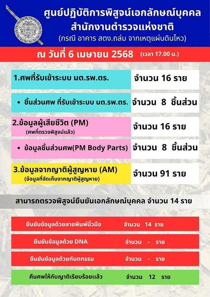 6 เม.ย.2568-ศูนย์ปฏิบัติการพิสูจน์เอกลักษณ์บุคคล สำนักงานตำรวจแห่งชาติ เปิดเผยกรณีอาคาร สตง.ถล่ม จากเหตุแผ่นดินไหว ณวันที่ 6 เม.ย.2568 เวลา 17.00 น. ศพที่รับเข้าระบบ สถานบันนิติเวช โรงพยาบาลตำรวจ จำนวน 16 ราย ชิ้นส่วนศพที่รับเข้าระบบ จำนวน 8 ชิ้นส่วน