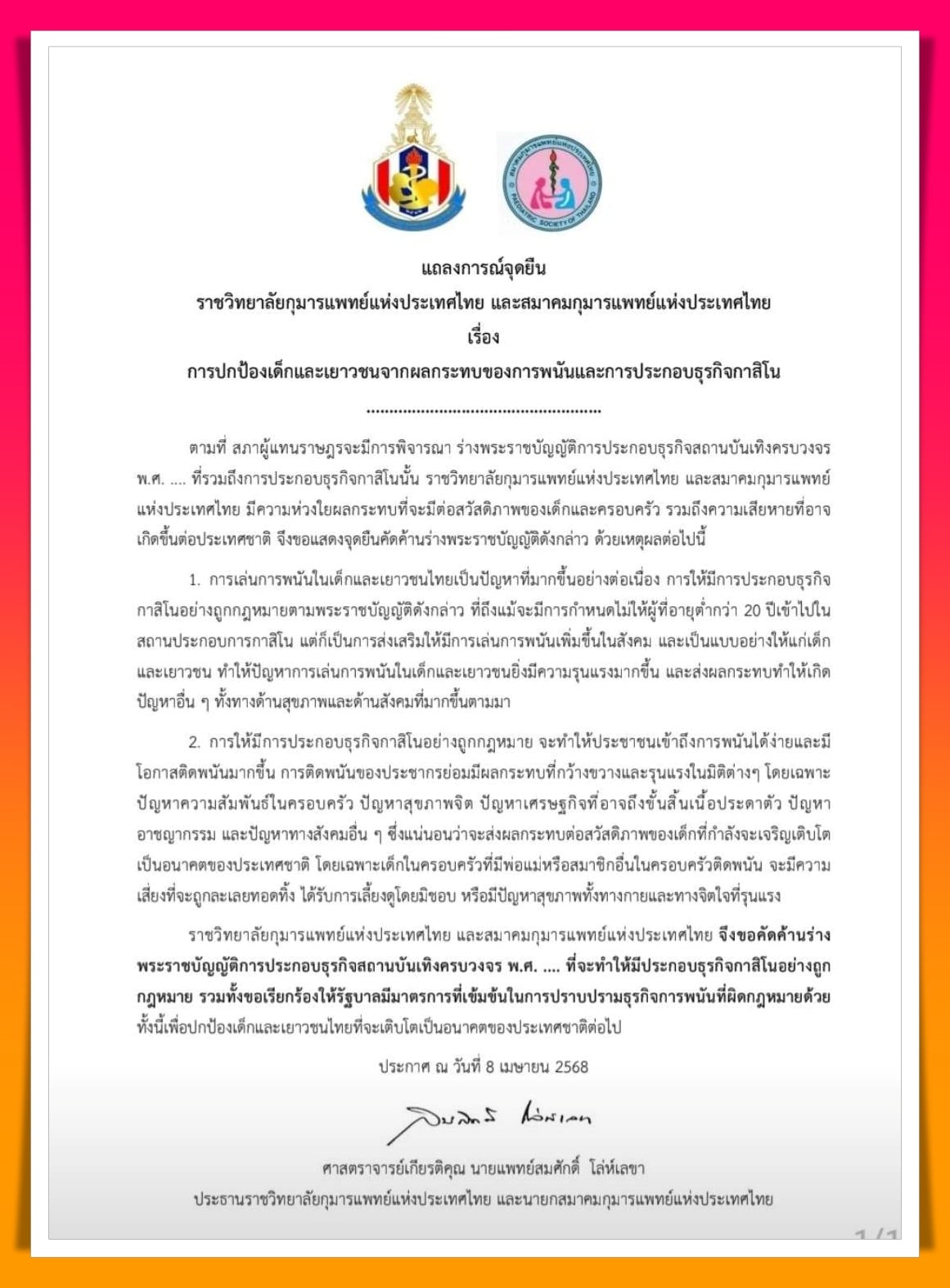ราชวิทยาลัยกุมารแพทย์แห่งประเทศไทย และสมาคมกุมารแพทย์แห่งประเทศไทย จึงขอคัดค้านร่างพระราชบัญญัติการประกอบธุรกิจสถานบันเทิงครบวงจร พ.ศ. ... ที่จะทำให้มีประกอบธุรกิจกาสิโนอย่างถูก