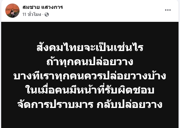 15 เม.ย.2568- สมชาย แสวงการ อดีตสว. โพสต์ข้อความสั้นๆว่า สังคมไทยจะเป็นเช่นไร ถ้าทุกคนปล่อยวาง บางทีเราทุกคนควรปล่อยวางบ้างในเมื่อคนมีหน้าที่รับผิดชอบจัดการปราบมาร กลับปล่อยวาง
