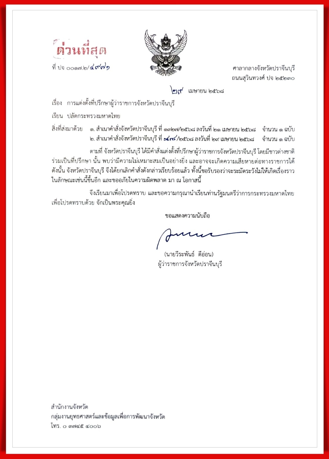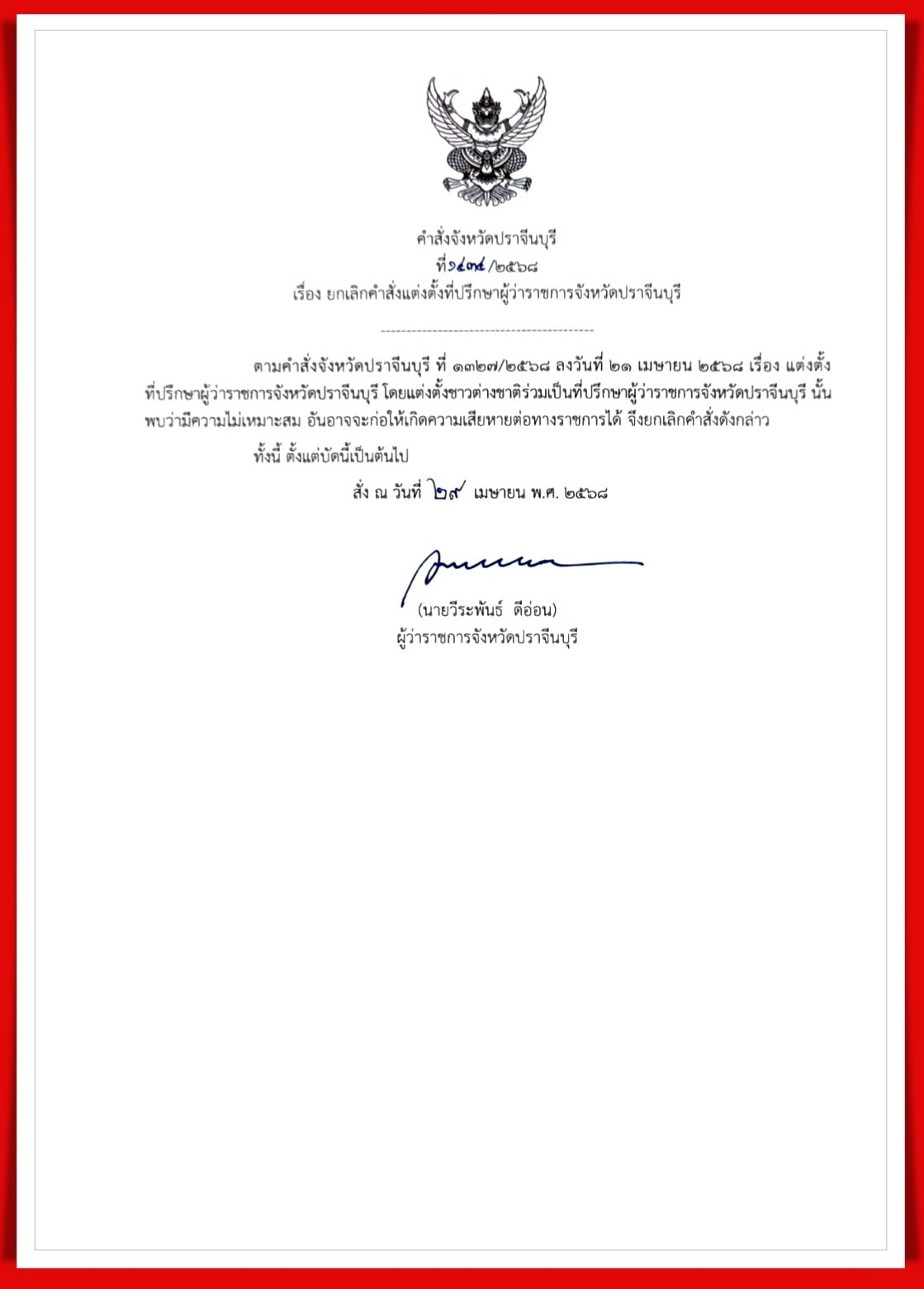 โดยล่าสุด เมื่อวานนี้ 29 เมษายน 2568 นายวีระพันธ์ ดีอ่อน ผู้ว่าราชการจังหวัดปราจีนบุรี ได้ออกหนังสือยกเลิกคำสั่งแต่งตั้งที่ปรึกษา เหตุพบว่ามีความไม่เหมาะสม อาจจะก่อให้เกิดความเสียหายกับทางราชการได้