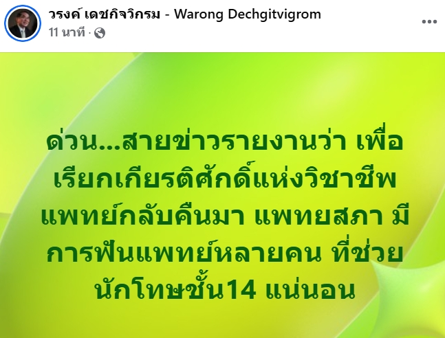 6 พ.ค. 2568- นพ.วรงค์ เดชกิจวิกรม ประธานพรรคไทยภักดี โพสต์เฟสบุ๊ก Warong Dechgitvigrom ว่า ด่วน…สายข่าวรายงานว่า เพื่อเรียกเกียรติศักดิ์แห่งวิชาชีพแพทย์กลับคืนมา แพทยสภา มีการฟันแพทย์หลายคน ที่ช่วยนักโทษชั้น14 แน่นอน