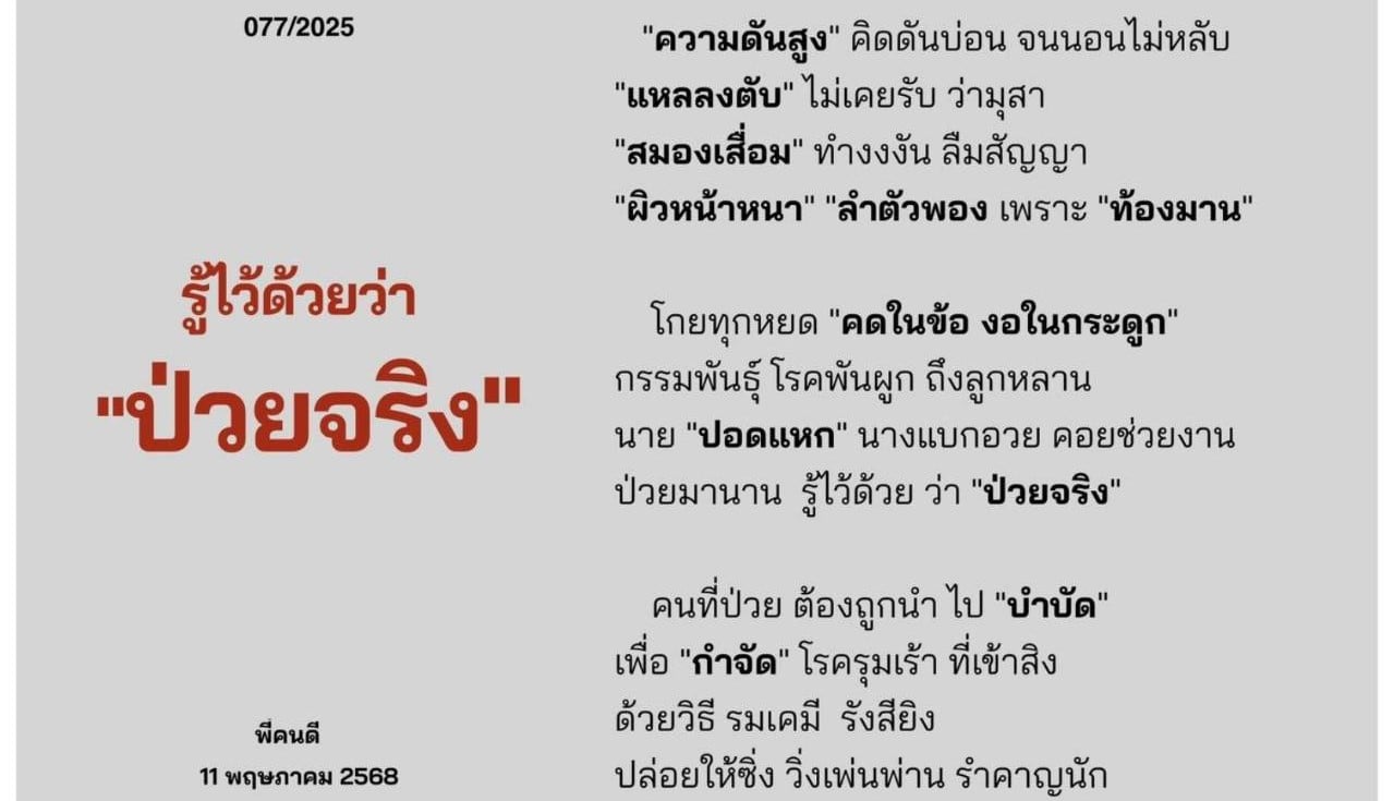 11 พ.ค.2568- เพจ P.khondee (พี่คนดี กวีสมัครเล่น) โพสต์ข้อความผ่านบทกลอน เรื่อง “รู้ไว้ด้วยว่า”ป่วยจริง”