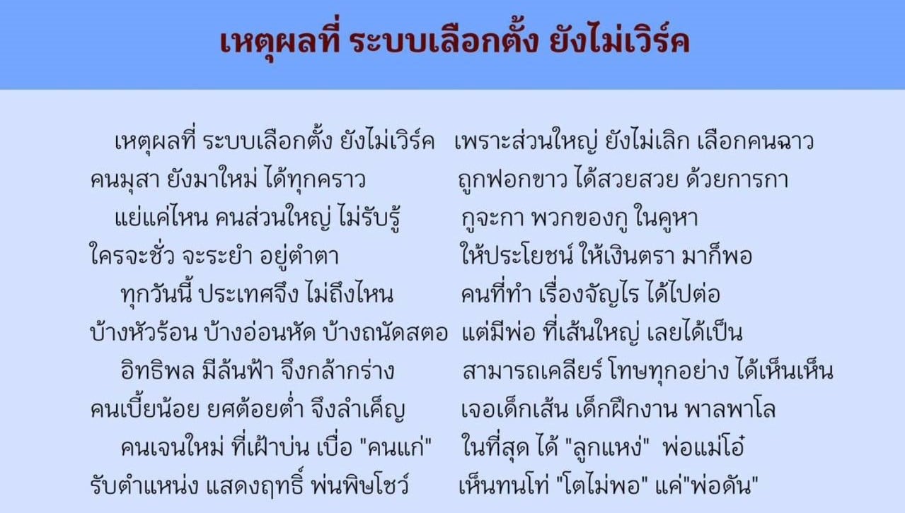 18 พ.ค.2568-เพจ P.khondee (พี่คนดี กวีสมัครเล่น) โพสต์ข้อความผ่านบทกลอน เรื่อง เหตุผลที่ ระบบเลือกตั้ง ยังไม่เวิร์ก