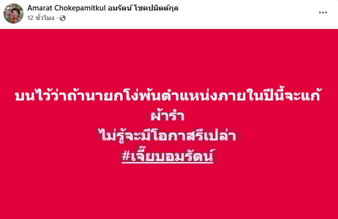 อดีต สส.ก้าวไกล “เจี๊ยบ อมรัตน์” เผยบนไว้ว่า “ถ้านายกฯ โง่พ้นตำแหน่งในปีนี้ จะแก้ผ้ารำ” ชาวเน็ตฮือฮา ขำกลิ้งลุ้นกันทั้งประเทศ ว่าจะได้ดูโชว์ฟรีหรือไม่