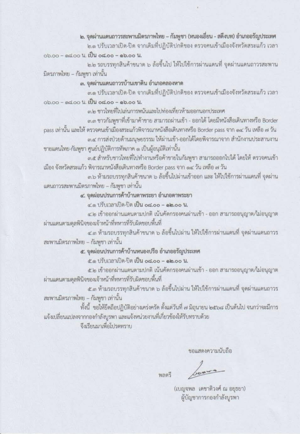 1. จุดผ่านแดนถาวรบ้านคลองลึก (อ.อรัญประเทศ) ปรับเวลาเปิด-ปิดเป็น 04.00–20.00 น. ผู้ที่ข้ามแดนต้องแสดงเอกสารถูกต้อง เช่น หนังสือเดินทางหรือบอร์เดอร์พาส