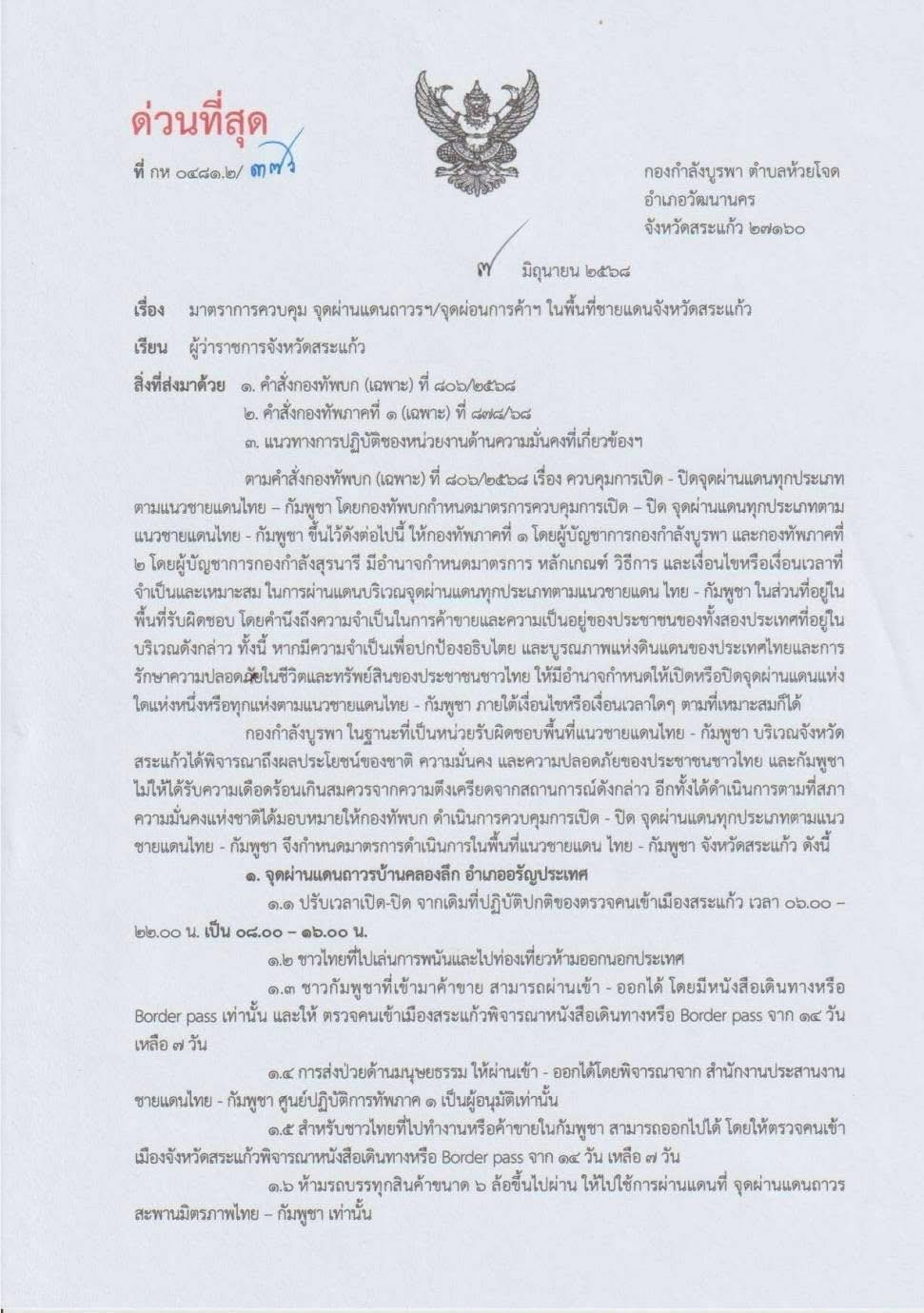 5. จุดผ่อนปรนการค้าบ้านหนองปรือ (อ.ตาพระยา) เปิด 06.00–20.00 น. สำหรับการค้าและสัญจรที่จำเป็นเท่านั้น