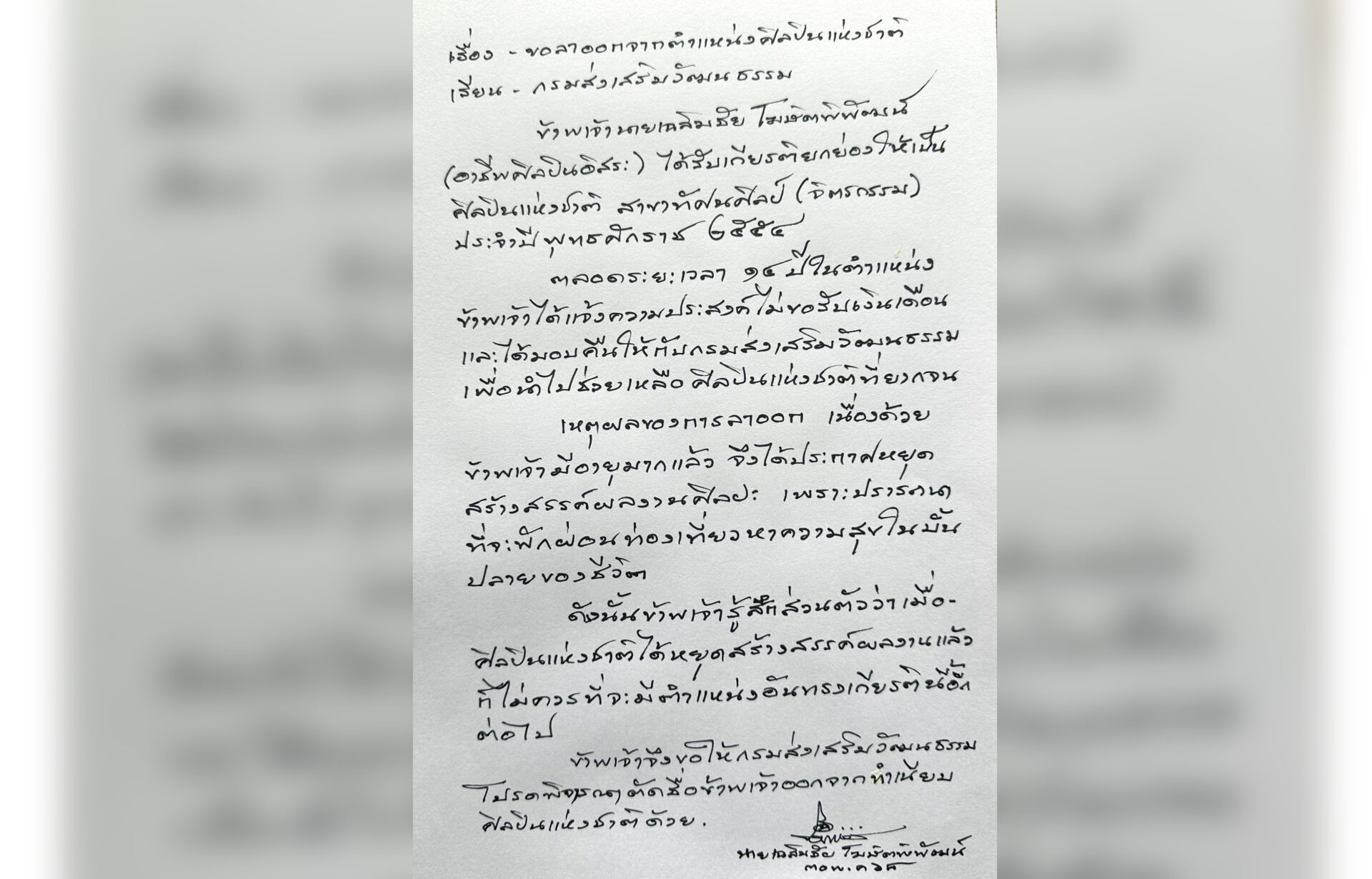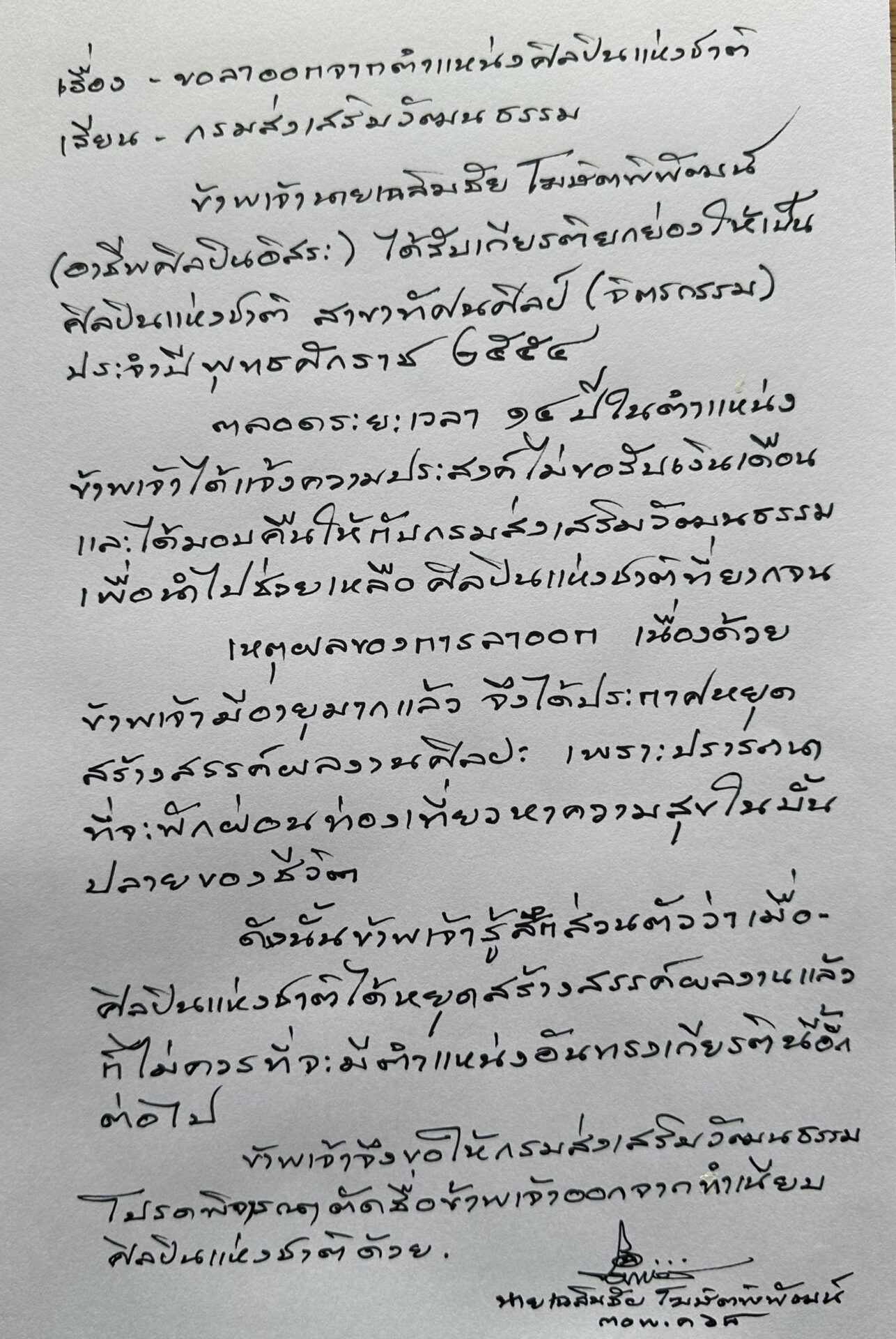 เรื่อง ขอลาออกจากตัวแหน่งศิลปินแห่งชาติ