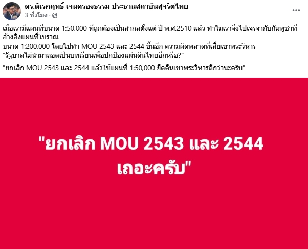 10 มิ.ย. 2568 – ดร.ดิเรกฤทธิ์ เจนครองธรรม ประธานสถาบันสุจริตไทย และอดีตสว. โพสต์เฟซบุ๊กระบุว่า เมื่อเรามีแผนที่ขนาด 1:50,000 ที่ถูกต้องเป็นสากลตั้งแต่ ปี พ.ศ.2510 แล้ว ทำไมเราจึงไปเจรจากับกัมพูชาที่อ้างอิงแผนที่โบราณ