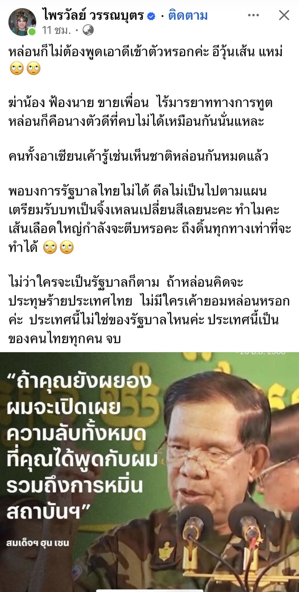 “แพรรี่” อินฟลูเอนเซอร์ชื่อดัง โพสต์เดือดผ่านเฟซบุ๊ก ซัด “หล่อนก็คือนางตัวดีที่คบไม่ได้เหมือนกันนั่นแหละ” พร้อมประณามพฤติกรรมฮุน เซนว่าไร้มารยาททางการทูต ลั่น “ประเทศนี้ไม่ใช่ของรัฐบาลไหน แต่เป็นของคนไทยทุกคน”