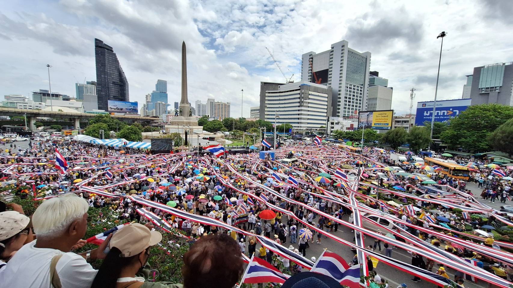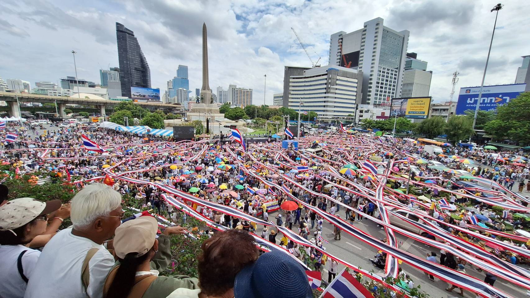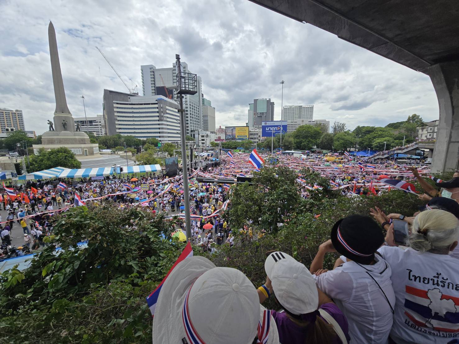 ธงชาติโบกสะบัด! ม็อบรวมพลังแผ่นดินจัดกิจกรรมเชิงสัญลักษณ์ ชุมนุมใหญ่อนุสาวรีย์ชัยฯ ช่วงบ่ายยิ่งคึกคัก มวลชนสมทบเข้าพื้นที่อย่างต่อเนื่อง เดินทางมากันแน่นรถไฟฟ้าบีทีเอส