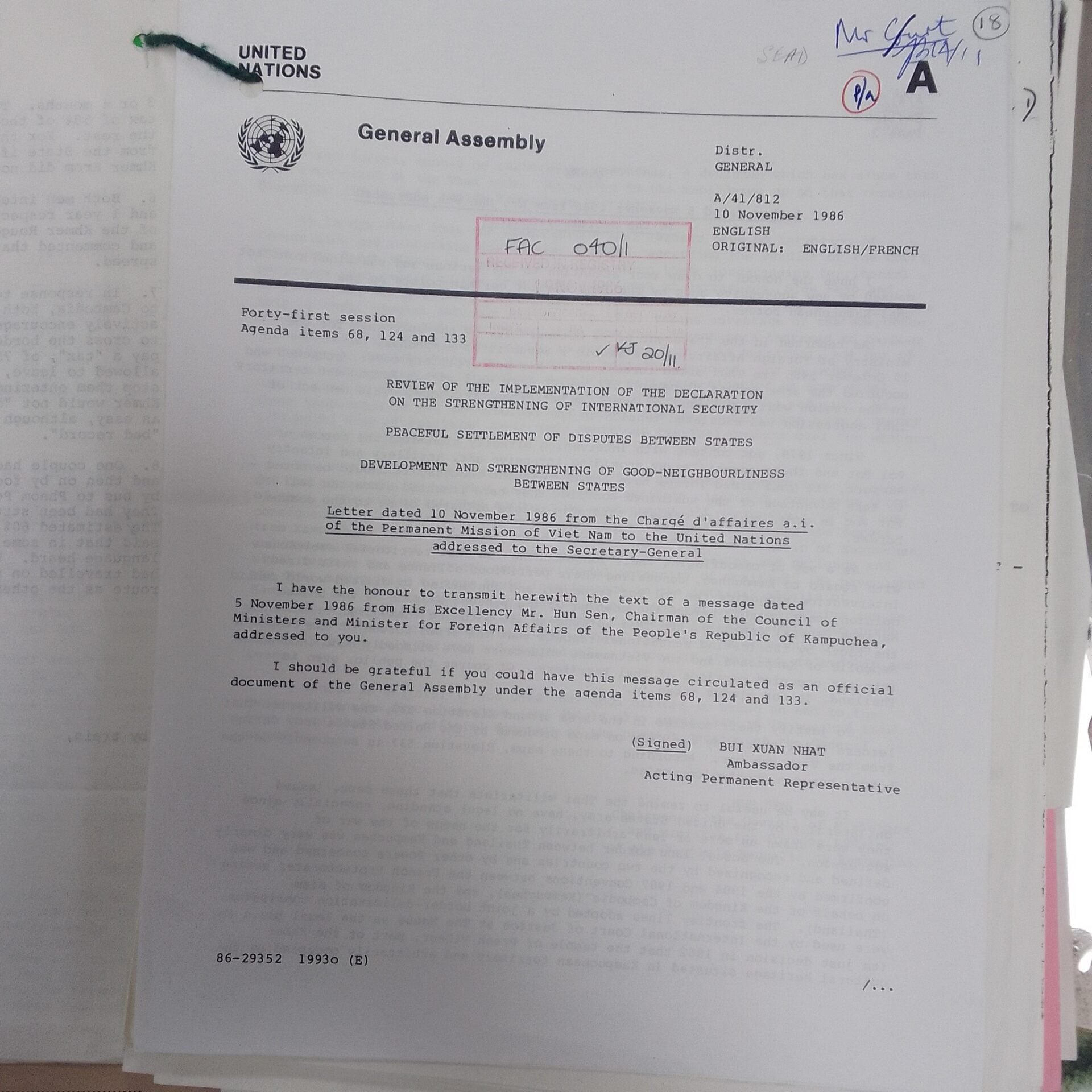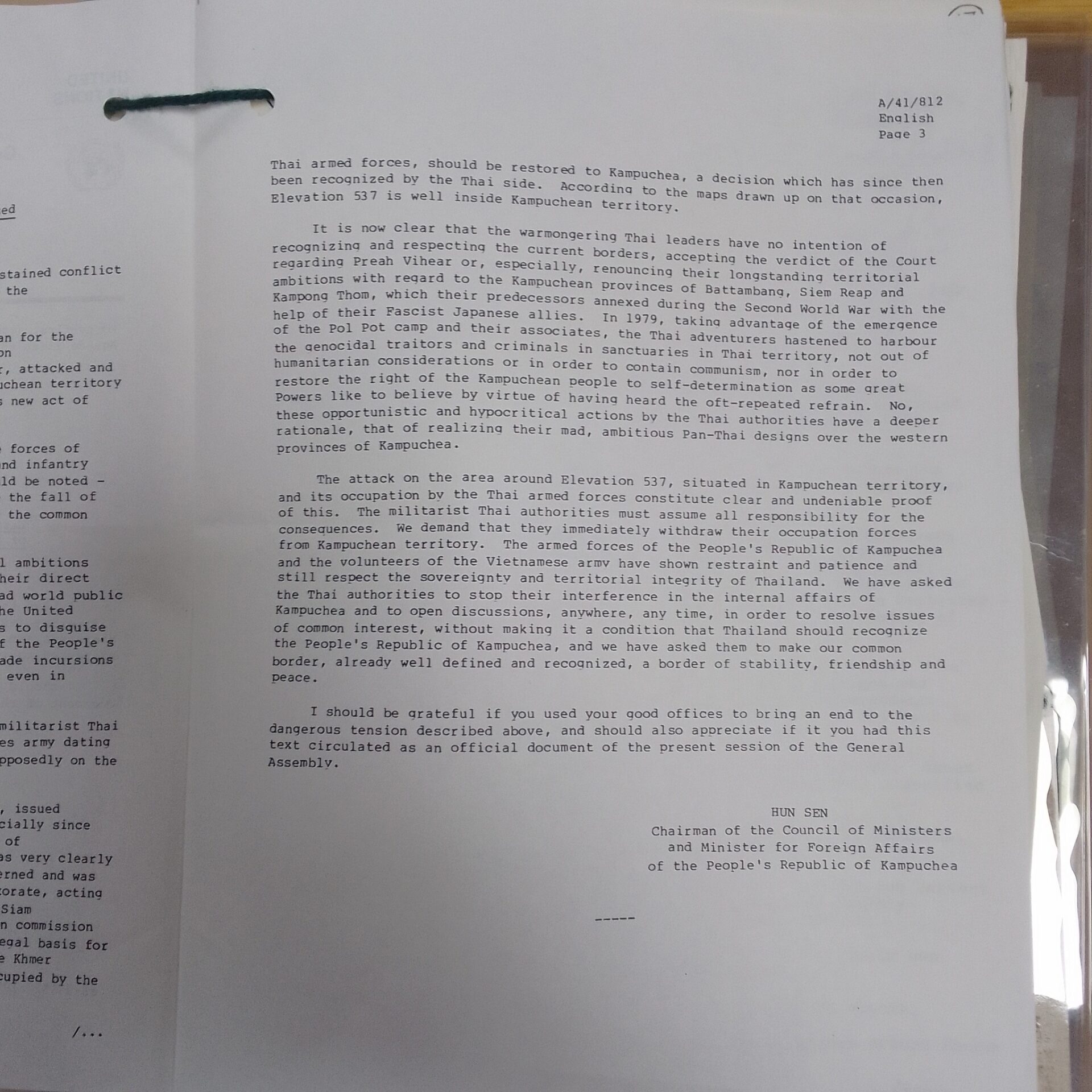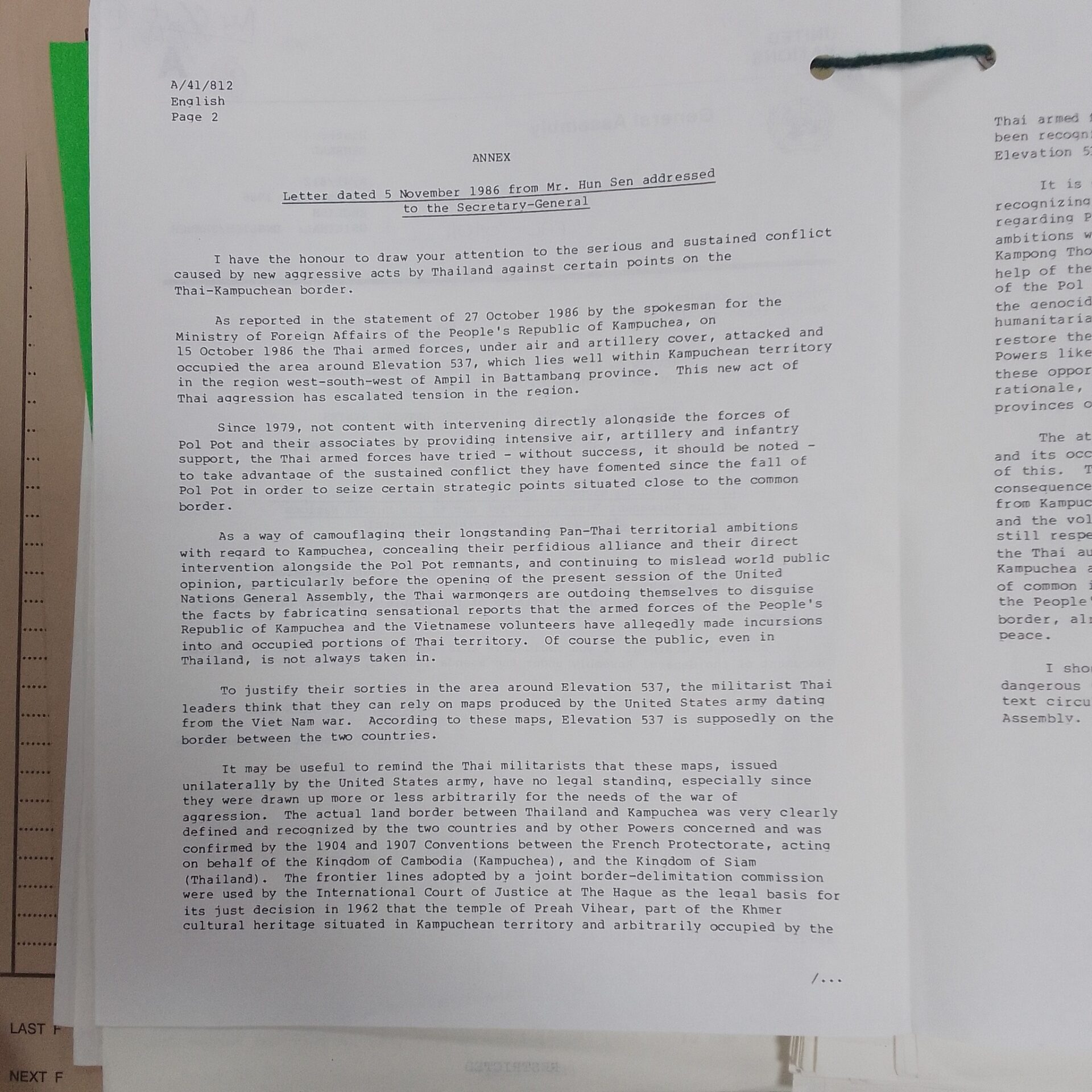 ขณะค้นคว้าเอกสารในช่วงสงครามเย็น ผมพบจดหมายจากปี 1986 ที่กัมพูชา (ในนามสาธารณรัฐประชาชนกัมพูชา) ส่งถึงเลขาธิการสหประชาชาติ ระบุชัดว่ามีการบุกรุกจากฝ่ายไทยบริเวณ Elevation 537 หรือ "เนิน 537." ที่น่าสนใจคือ: