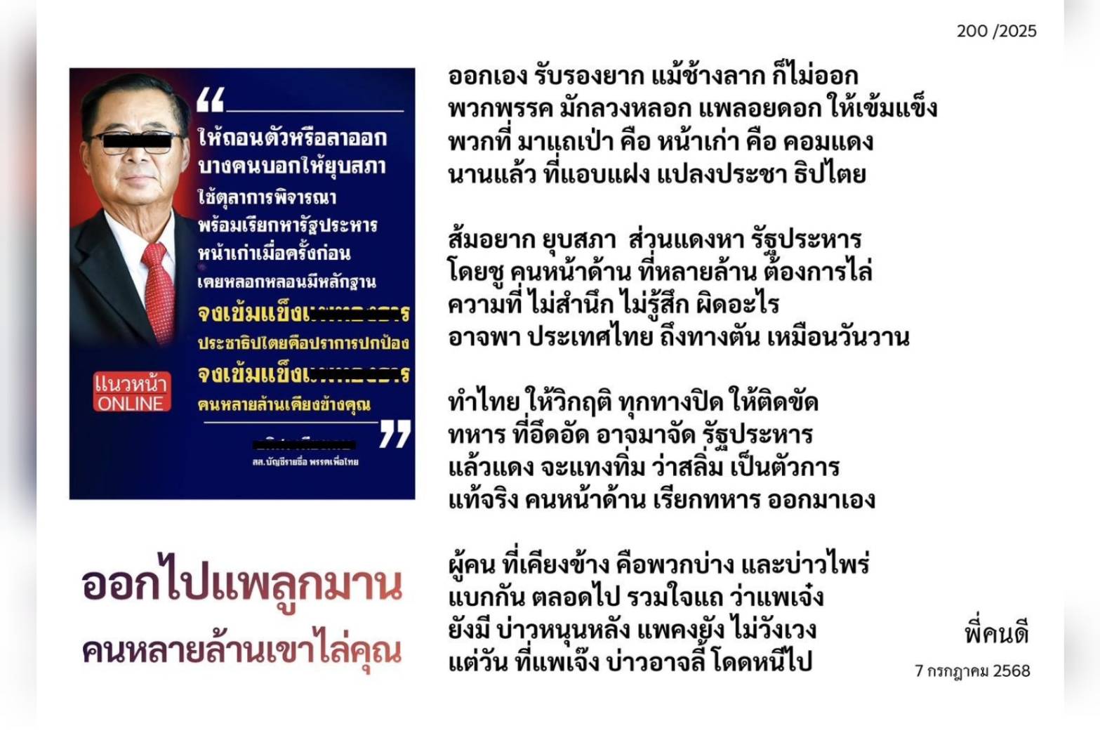 7 ก.ค.2568-เพจ P.khondee ( พี่คนดี กวีสมัครเล่น) ได้โพสต์กลอนเรื่อง คนที่ไล่แพ นั้นคือหน้าเก่าทั้งนั้นจริงหรือ ด้อมส้มที่เคยเป็นพันธมิตร เดี๋ยวนี้เขาก็เกลียดนะ หลายคนที่เคยเลือก เขาก็ไม่เอาแล้ว ไอ้ที่ว่า หน้าเก่า นั้นก็คือ บ่าวเชียร์ บ่าวแบก