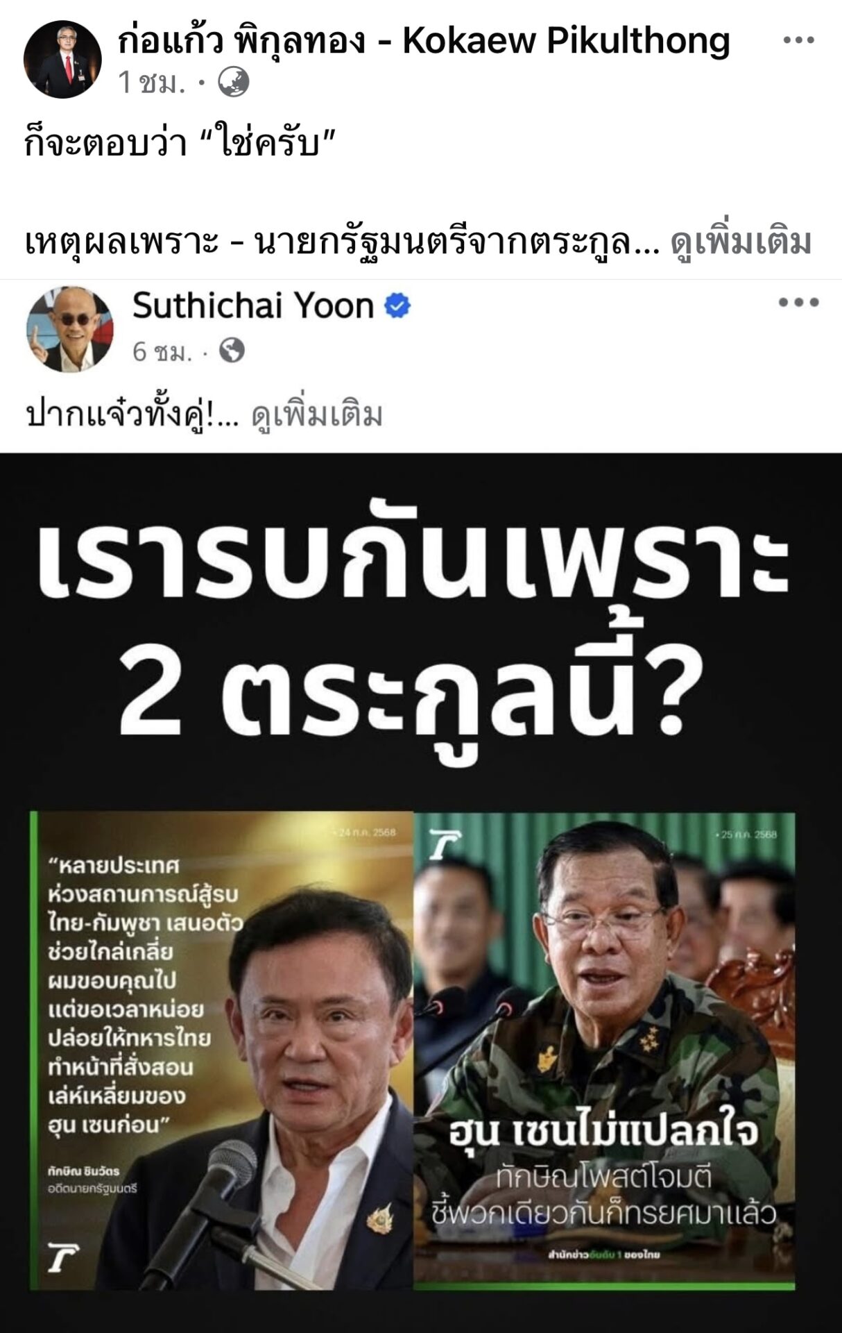 25 กรกฎาคม 2568 - นายก่อแก้ว พิกุลทอง สส. บัญชีรายชื่อพรรคเพื่อไทย โพสต์เฟซบุ๊กว่า ก็จะตอบว่า “ใช่ครับ”