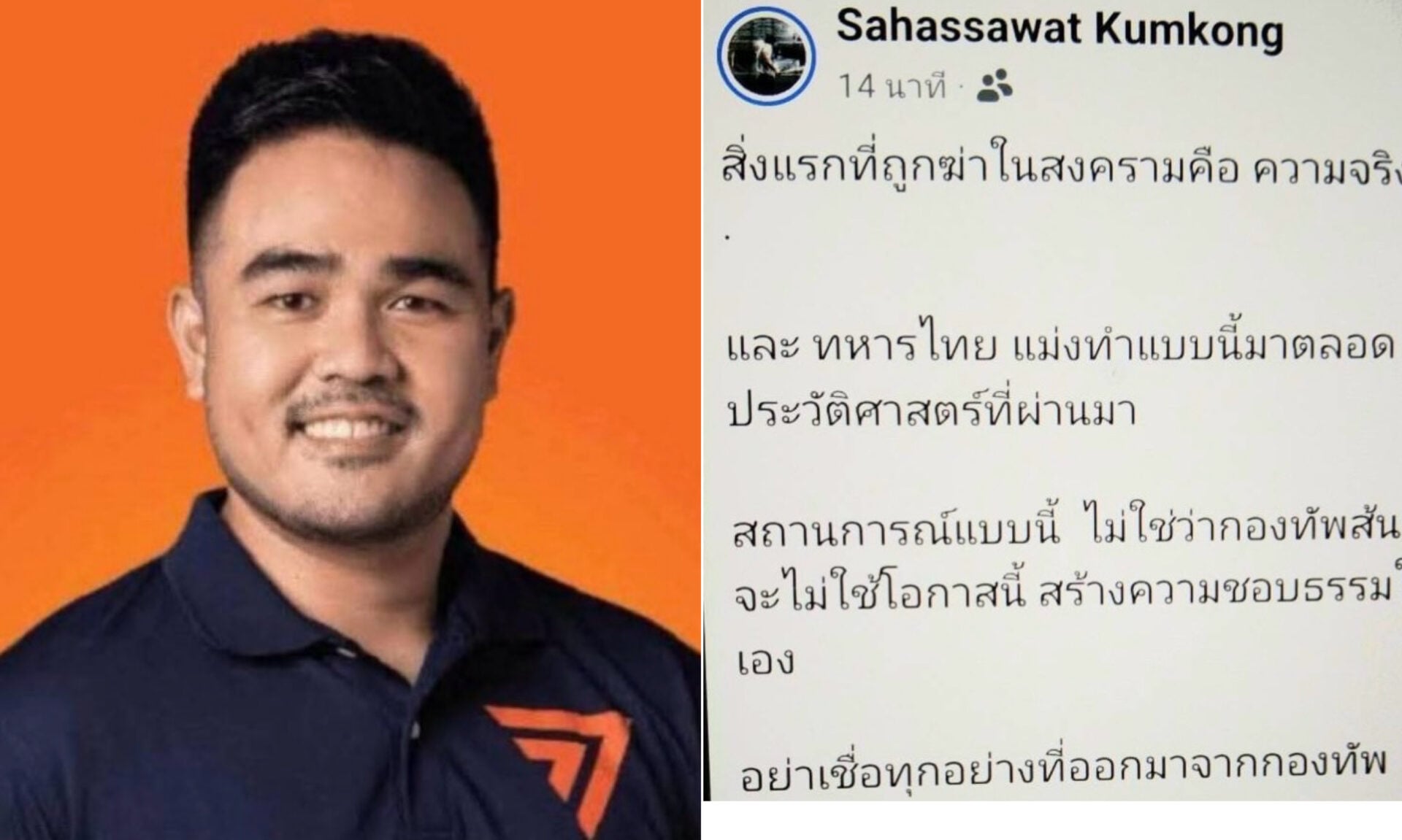 ผู้สื่อข่าวรายงานว่าเมื่อวันที่ 28 กรกฎาคม ที่ผ่านมา นายสหัสวัต คุ้มคง สส.ชลบุรี พรรคประชาชน(ปชน.) ได้โพสต์เฟซบุ๊กระบุว่า สิ่งแรกที่ถูกฆ่าในสงครามคือ ความจริง
