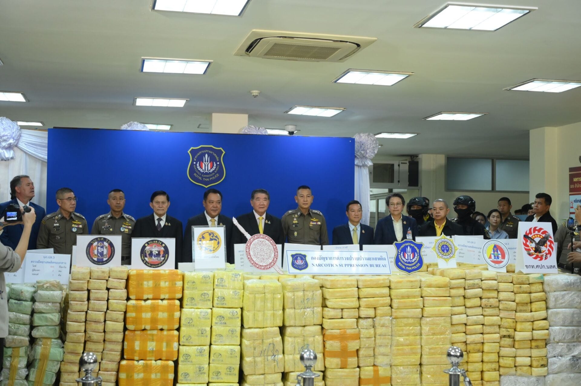 30 ก.ค.2568 - นายภูมิธรรม เวชยชัย รองนายกรัฐมนตรีและรัฐมนตรีว่าการกระทรวงมหาดไทย รักษาราชการแทนนายกรัฐมนตรี เป็นประธานแถลงข่าวผลการจับกุมคดียาเสพติดรายสำคัญภายใต้นโยบายเร่งด่วนในการปราบปรามและตัดวงจรการค้ายาเสพติดอย่างเข้มข้น โดยมี นายทวี สอดส่อง รัฐมนตรีว่าการกระทรวงยุติธรรม นายอรรษิษฐ์ สัมพันธรัตน์ ปลัดกระทรวงมหาดไทย พล.ต.อ.กิตติ์รัฐ พันธุ์เพ็ชร์ ผู้บัญชาการตำรวจแห่ง น.ส.อารีภักดิ์ เงินบำรุง รองเลขาธิการคณะกรรมการป้องกันและปราบปรามยาเสพติด (ป.ป.ส.) พล.ต.ท.สำราญ นวลมา ผู้ช่วยผู้บัญชาการตำรวจแห่งชาติ พล.ต.ท.สันติ ชัยนิรามัย ผู้บัญชาการตำรวจปราบปรามยาเสพติด (บช.ปส.) และหน่วยงานที่เกี่ยวข้อง ร่วมแถลงข่าว ณ ห้องประชุมพรหมนอก ชั้น 2 กองบัญชาการตำรวจปราบปรามยาเสพติด ถ.วิภาวดีรังสิต กรุงเทพฯ