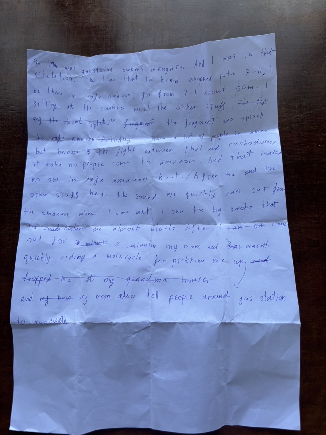 เปิดจดหมายลูกสาวเจ้าของปั๊ม ปตท. บ้านผือ เล่านาทีสะเทือนใจ จรวดกัมพูชาลงร้านสะดวกซื้อ ให้ทูตนานาชาติฟัง เผยห่างเพียงแค่ 20 เมตร