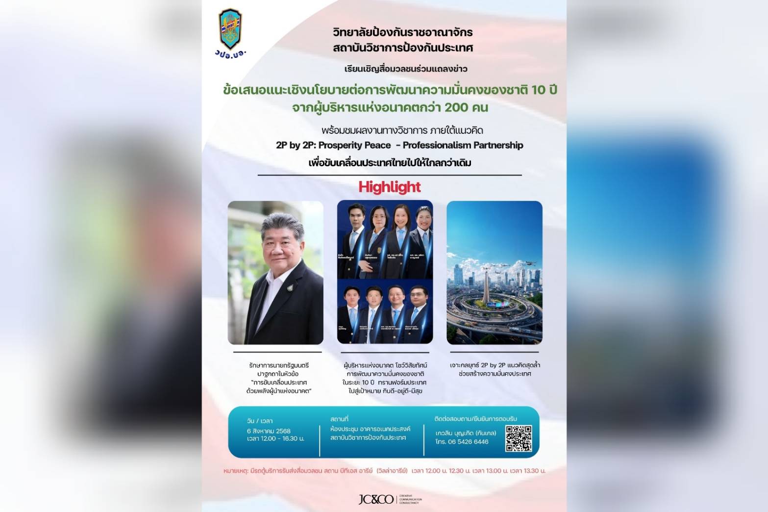 4 ส.ค.2568-มีรายงานว่า วิทยาลัยป้องกันราชอาณาจักร สถาบันวิชาการป้องกันประเทศ แจ้งสื่อมวลชนร่วมงานแถลงข่าว ข้อเสนอแนะเชิงนโยบายต่อการพัฒนาความมั่นคงของชาติ 10 ปี จากผู้บริหารแห่งอนาคตกว่า 200 คน จาก 5 ภาคส่วน ได้แก่ภาคการทหาร ภาคข้าราชการพลเรือน ภาคการเมือง ภาคเอกชน และภาคประชาชน ในหลักสูตรการป้องกันราชอาณาจักร สำหรับผู้บริหารแห่งอนาคต (วปอ.บอ.) รุ่นที่ 2 ประจำปีการศึกษา 2568 ในวันที่ 6 ส.ค.2568 เวลา 12.00 – 16.30 น. ณ ห้องประชุม อาคารอเนกประสงค์ สถาบันวิชาการป้องกันประเทศ โดยมีนายภูมิธรรม เวชชยชัย รองนายกรัฐมนตรีและรัฐมนตรีว่าการกระทรวงมหาดไทย ในฐานะรักษาการนายกรัฐมนตรี