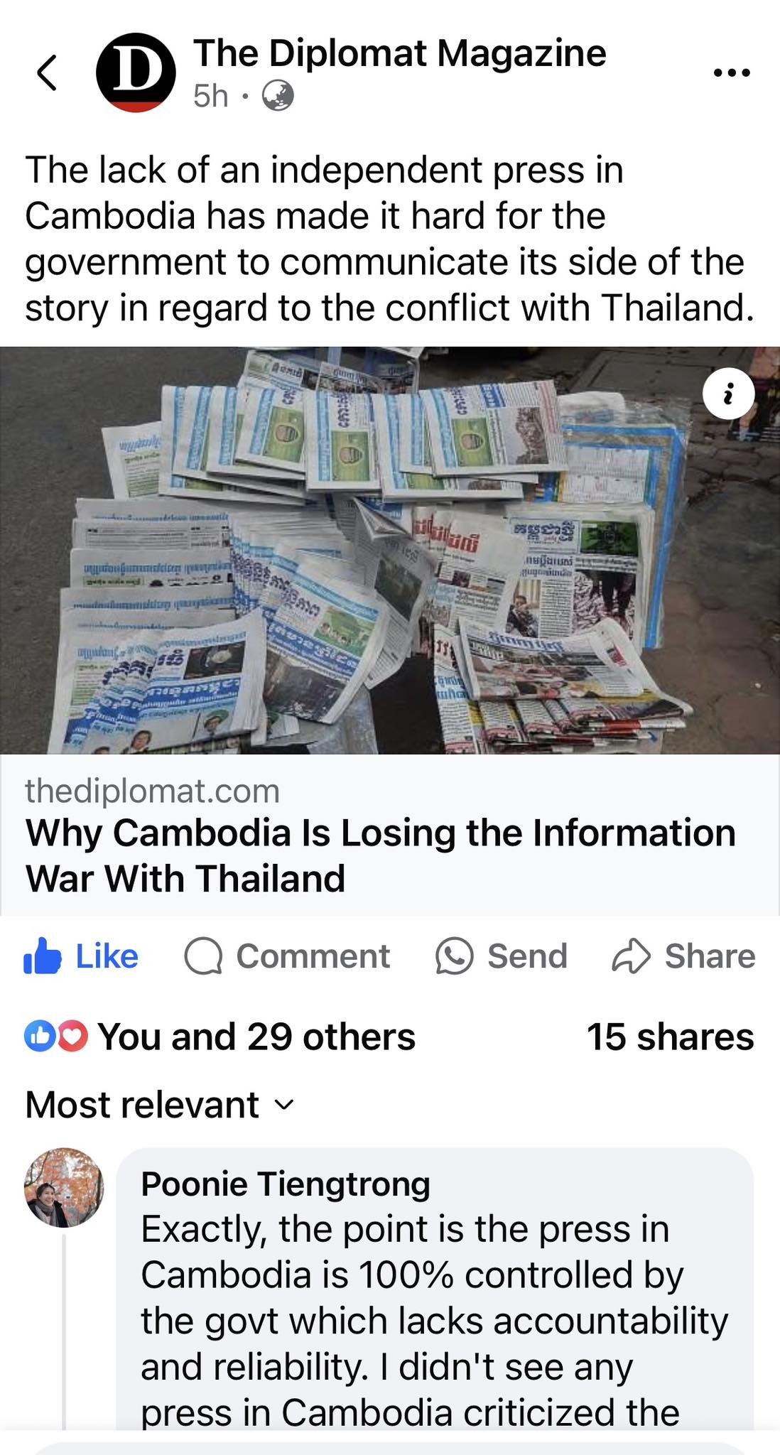 นี่เป็นสิ่งเดียวกับที่ผมคิดมาตลอดก่อนหน้า และการที่ทางการกัมพูชาไม่สนใจความถูกต้องน่าเชื่อถือของข้อมูลข่าวสารที่สื่อออกไป มุ่งโจมตีไทยโดยใช้ช่าวปลอมเฟคนิวส์หลายกรณี จะเท่ากับกัมพูชากำลังเซาะกร่อนบ่อนทำลายความน่าเชื่อถือของของเขาเอง