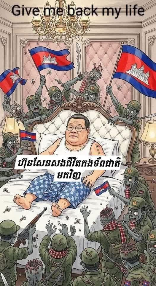 12 ส.ค. 2568 – นายสม รังสี แกนนำฝ่ายค้านกัมพูชาที่ลี้ภัยอยู่ในฝรั่งเศส โพสต์ภาพการ์ตูนล้อเลียน ซึ่งเป็นภาพบุคคลลักษณะคล้าย “ฮุน เซน” ประธานวุฒิสภากัมพูชา ที่มีตัวการ์ตูนฅซอมบี้หรือผีทหารกัมพูชารายล้อมรอบเตียง พร้อมข้อความว่า “ฮุน เซน คืนชีวิตทหารกลับคืนมา”