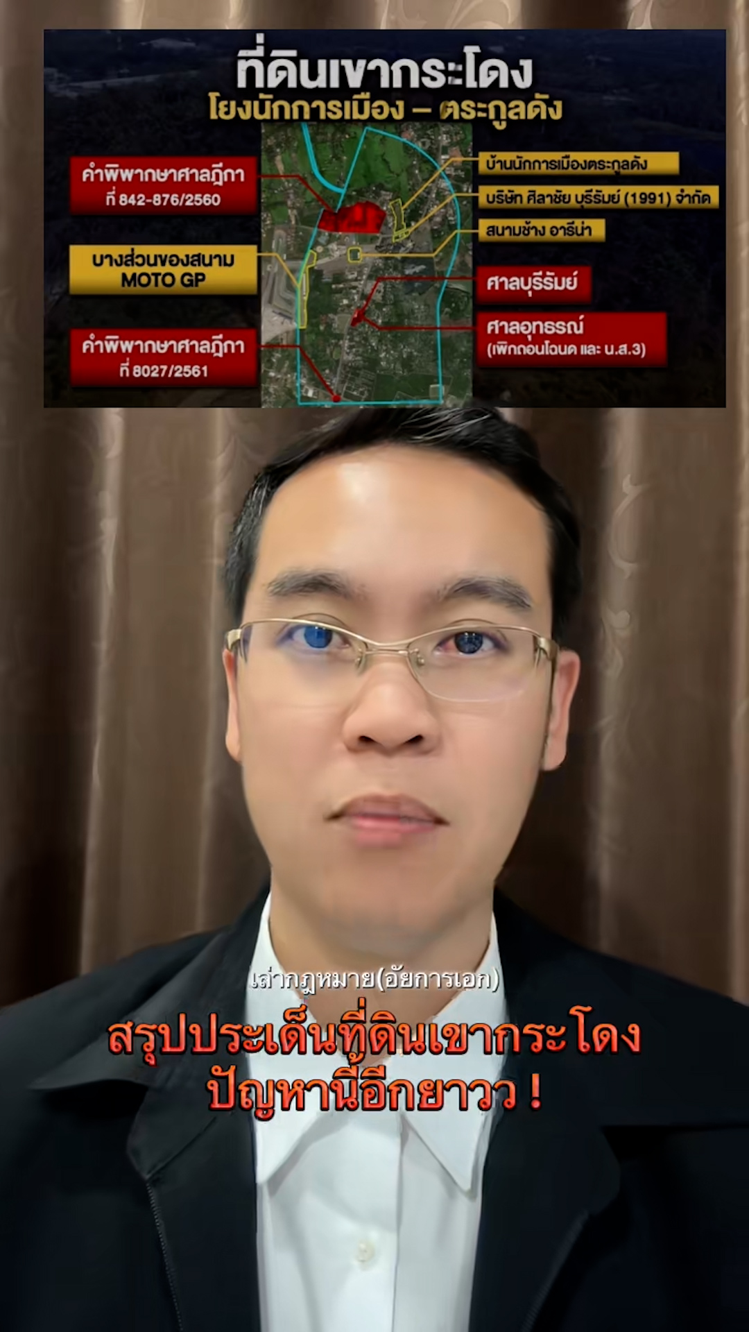 ถึงปัญหาข้อพิพาทที่ดินเขากระโดง จ.บุรีรัมย์ ว่า ที่ดินเขากระโดงซึ่งมีพื้นที่กว่า 5,000 ไร่ ระหว่างประชาชนผู้ถือเอกสารสิทธิหลายประเภท กับการรถไฟแห่งประเทศไทย (รฟท.) ที่อ้างสิทธิ์ในที่ดินตามกฎหมายกฤษฎีกาสมัยรัชกาลที่ 6 โดยปัญหาเริ่มต้นจากประชาชน 35 รายที่ครอบครองที่ดินกว่า 170 ไร่ อ้างสิทธิตามหนังสือ ส.ค.1 ซื้อต่อมาจากเจ้าของเดิมตั้งแต่ปี 2471 และมาแจ้งการครอบครองในปี 2498 ต่อมาในปี 2553 เมื่อมีการประกาศจะออกโฉนด กลุ่มคนเหล่านี้จึงไปยื่นขอออกโฉนด แต่ถูก รฟท.คัดค้าน โดยอ้างว่าเป็นที่ดินของ รฟท. ต่อมาในปี 2554 คนกลุ่มนี้ได้ยื่นฟ้อง รฟท.เป็นคดีเพ่งต่อศาลจังหวัดบุรีรัมย์ แต่ก็ถูก รฟท.ฟ้องแย้ง สุดท้ายศาลฎีกาตัดสินให้ รฟท.ชนะคดี โดยให้เหตุผลว่าที่ดินของชาวบ้านกลุ่มนี้อยู่ในแนวเขตของแผนที่ที่กำหนดให้สร้างทางรถไฟ ซึ่งมีพระราชกฤษฎีกาออกเป็นกฎหมายตั้งแต่สมัยรัชกาลที่ 6 (ปี 2461-2465) ปัจจุบันชาวบ้าน 35 รายที่แพ้คดี ได้ถูกบังคับคดีให้รื้อสิ่งปลูกสร้างและออกจากพื้นที่แล้ว