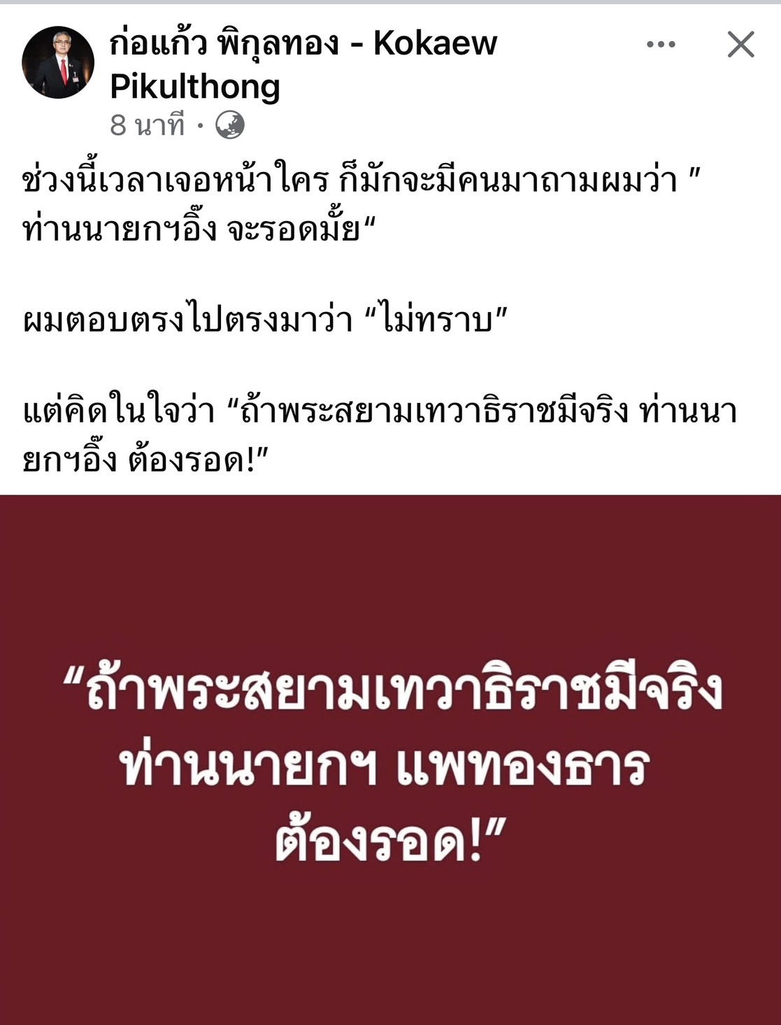 14 สิงหาคม 2568 - นายก่อแก้ว พิกุลทอง สส.บัญชีรายชื่อพรรคเพื่อไทย โพสต์เฟซบุ๊ก ว่า ช่วงนี้เวลาเจอหน้าใคร ก็มักจะมีคนมาถามผมว่า ”ท่านนายกฯอิ๊งค์ จะรอดมั้ย“