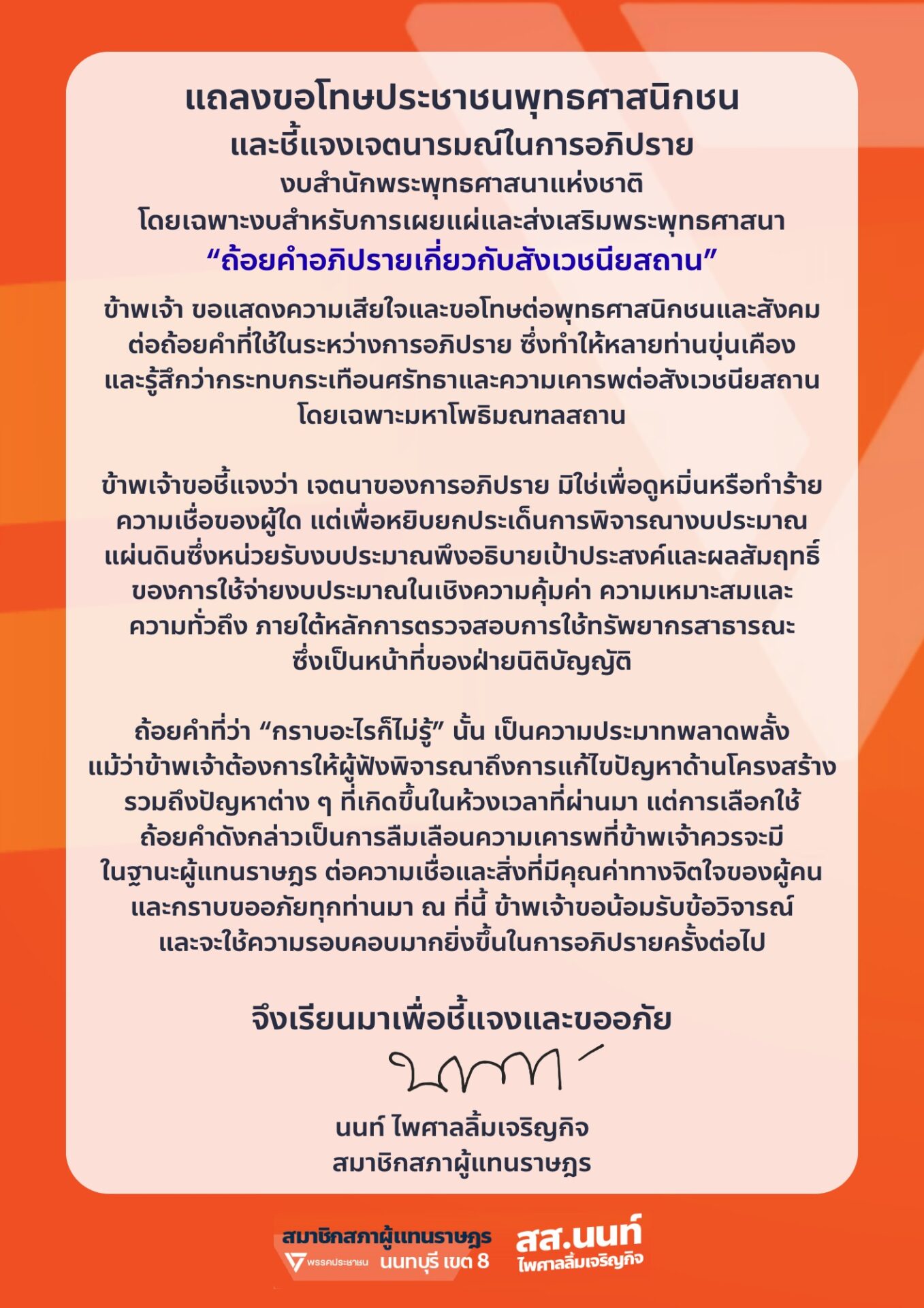 ถ้อยคำที่ว่า “กราบอะไรก็ไม่รู้” นั้น เป็นความประมาทพลาดพลั้ง แม้ว่าข้าพเจ้าต้องการให้ผู้ฟังพิจารณาถึงการแก้ไขปัญหาด้านโครงสร้างรวมถึงปัญหาต่าง ๆ ที่เกิดขึ้นในห้วงเวลาที่ผ่านมา แต่การเลือกใช้ถ้อยคำดังกล่าวเป็นการลืมเลือนความเคารพที่ข้าพเจ้าควรจะมีในฐานะผู้แทนราษฎร ต่อความเชื่อและสิ่งที่มีคุณค่าทางจิตใจของผู้คน และกราบขออภัยทุกท่านมา ณ ที่นี้ ข้าพเจ้าขอน้อมรับข้อวิจารณ์ และจะใช้ความรอบคอบมากยิ่งขึ้นในการอภิปรายครั้งต่อไป