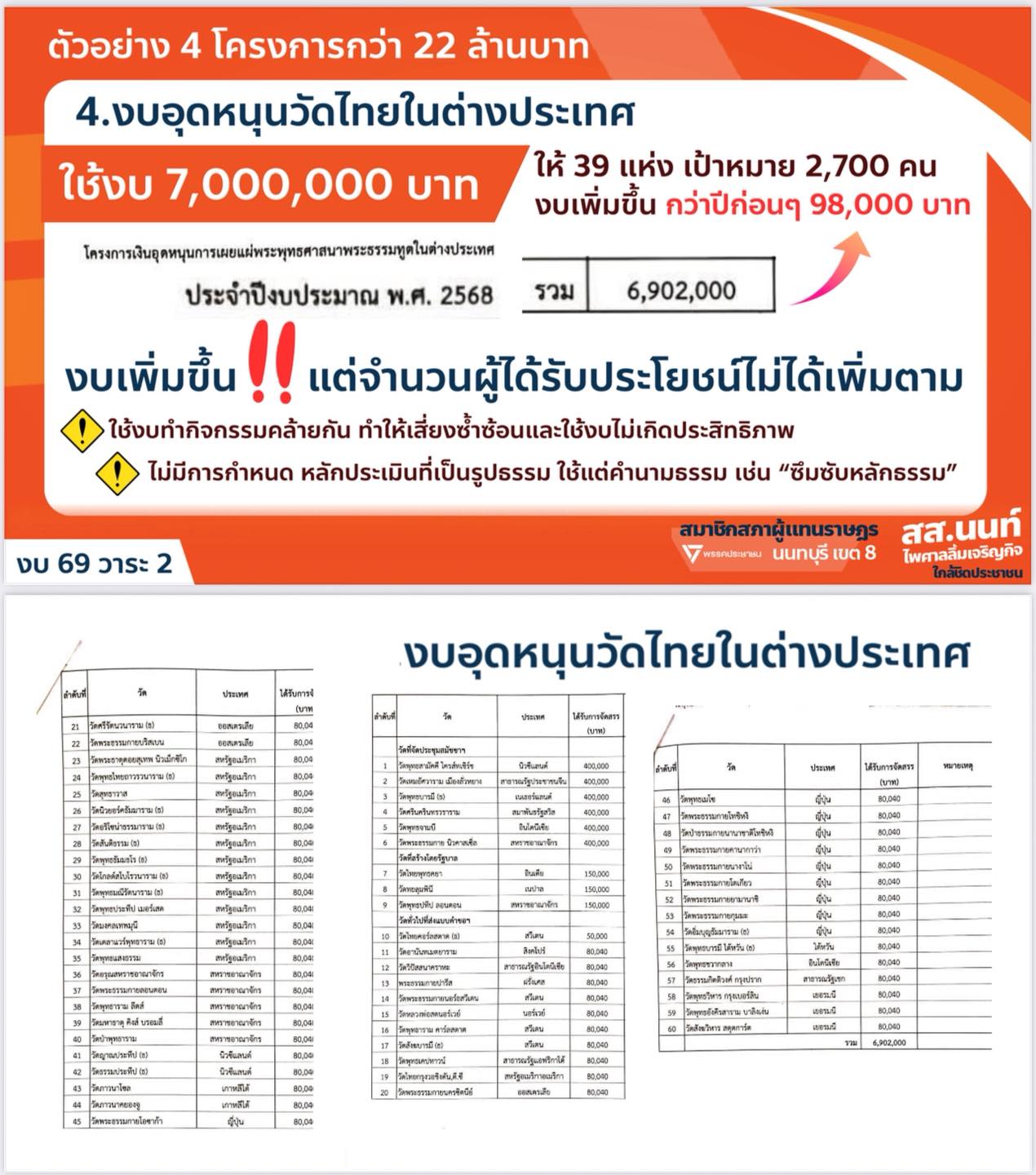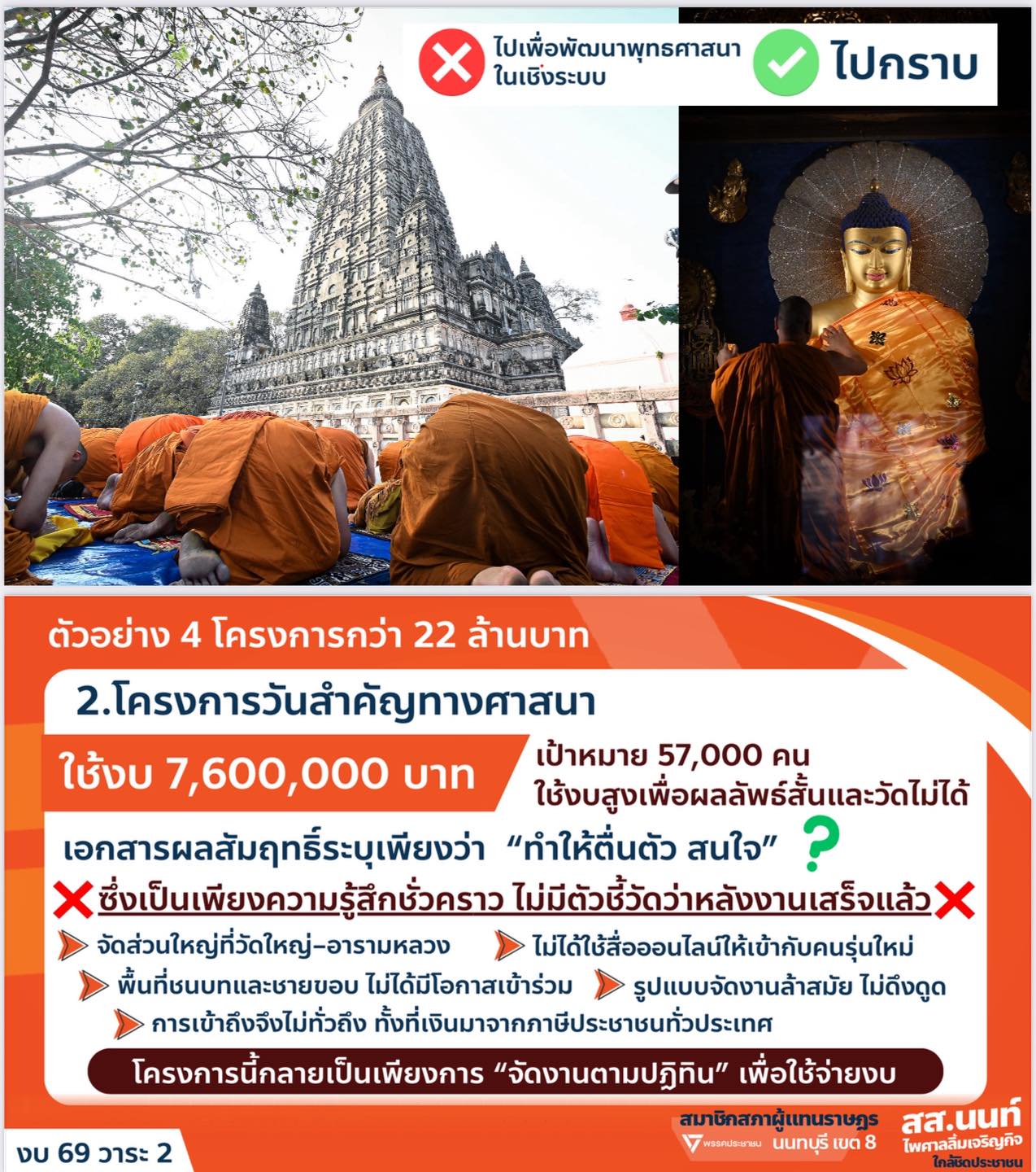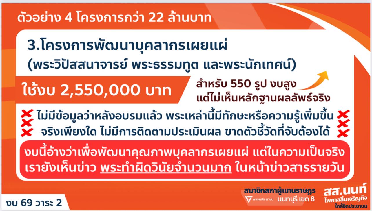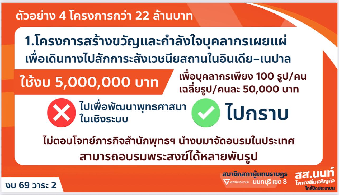 16 สิงหาคม 2568 - กรณีนายนนท์ ไพศาลลิ้มเจริญกิจ ส.ส.นนทบุรี พรรคประชาชน เสนอตัดงบประมาณรายจ่ายประจำปี 2569 ของสำนักงานพระพุทธศาสนาแห่งชาติ (พศ.) โดยยกตัวอย่าง โครงการสร้างขวัญและกำลังใจบุคลากรเผยแผ่เพื่อเดินทางไปสักการะสังเวชนียสถานในอินเดีย-เนปาล ไม่คุ้มค่า ไม่เกิดประโยชน์ ไม่ตอบโจทย์ภารกิจสำนักพุทธฯ พร้อมเสนอให้ยกเลิกโครงการทั้งหมด พร้อมถ้อยคำว่า "กราบอะไรก็ไม่รู้"