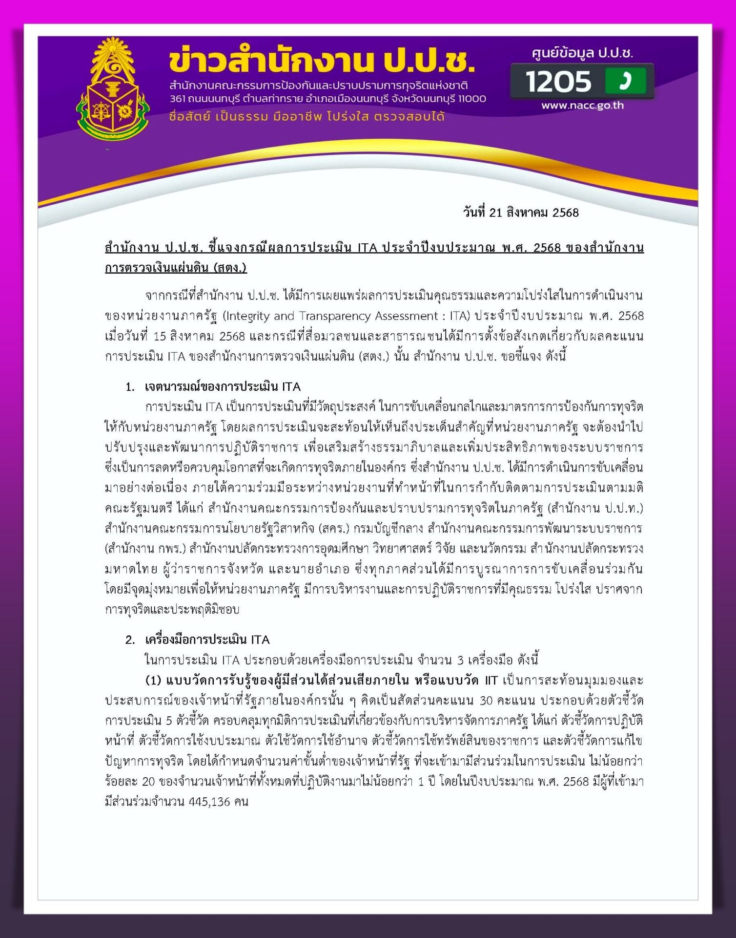 21 ส.ค.2568 - สำนักงานคณะกรรมการป้องกันและปราบปรามการทุจริตแห่งชาติ (ป.ป.ช.) ได้ออกเอกสารชี้แจงกรณีที่มีการตั้งข้อสังเกตเกี่ยวกับผลคะแนนการประเมินคุณธรรมและความโปร่งใสในการดำเนินงานของหน่วยงานภาครัฐ (ITA) ของสำนักงานการตรวจเงินแผ่นดิน (สตง.) ว่า ผลคะแนนการประเมิน ITA ประจำปีงบประมาณ พ.ศ.2568 สตง.ในภาพรวมมีคะแนนสูงขึ้นจากเดิมในปี 2567 จากเดิม 92.43 คะแนน เป็น 94.64 คะแนน เนื่องจากมีการดำเนินการเปิดเผยข้อมูลสาธารณะตามแบบวัดการเปิดเผยข้อมูลสาธารณะ (OIT) ตามหลักเกณฑ์ในระดับที่ดีขึ้นกว่าปีที่ผ่านมา แต่อย่างไรก็ตาม ระดับผลการประเมินในเชิงคุณภาพ (Rating Score) ได้ถูกปรับลดลง 1 ระดับจากระดับผ่านดี ลดลงเหลือระดับผ่านเท่านั้น เนื่องจากมีระดับผลการประเมินในส่วนของประชาชนและผู้ที่มาติดต่อหรือรับบริการ ซึ่งสำนักงาน ป.ป.ช. เป็นผู้สำรวจข้อมูลแบบวัดการรับรู้ของผู้มีส่วนได้ส่วนเสียภายนอก (EIT) ส่วนที่ 2 ที่ต่ำกว่าเกณฑ์ 85 คะแนนตามหลักเกณฑ์ที่สำนักงาน ป.ป.ช. กำหนด ทั้งนี้ สตง.ยังคงต้องพัฒนาและปรับปรุงในส่วนนี้ให้ดียิ่งขึ้นต่อไป
