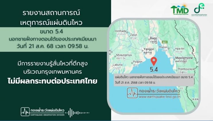 21 สิงหาคม 2568 - เวลา 09.58 น. วันนี้ กองเฝ้าระวังแผ่นดินไหว กรมอุตุนิยมวิทยา รายงานแผ่นดินไหวในทะเล ขนาด 5.4 ความลึก 10 กม. บริเวณใกล้ชายฝั่งทางตอนใต้ของประเทศเมียนมา ทางทิศตะวันตกเฉียงใต้ของ อ.แม่สอด จ.ตาก ประมาณ 211 กม.