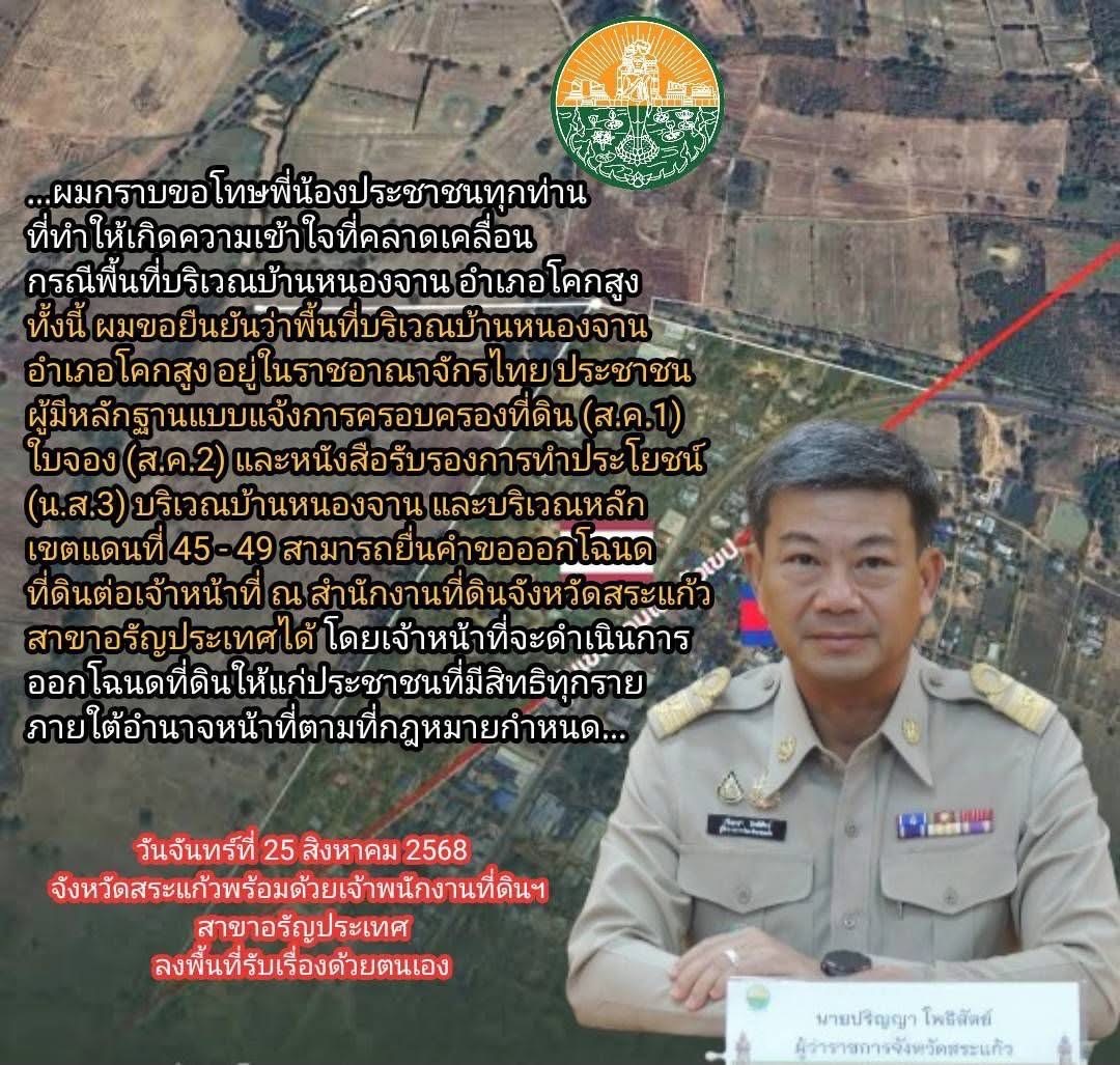 23 สิงหาคม 2568 - เพจเฟซบุ๊ก “สวท.สระแก้ว” เผยแพร่สารจากนายปริญญา โพธิสัตย์ ผู้ว่าราชการจังหวัดสระแก้ว ชี้แจงกรณีแถลงข่าวร่วมกับแม่ทัพภาคที่ 1 ถึงผลการหารือของคณะกรรมการชายแดนส่วนภูมิภาคไทย-กัมพูชา หรืออาร์บีซี เมื่อวันที่ 22 ส.ค. ที่ผ่านมา โดยช่วงหนึ่งนายปริญญาตอบคำถามผู้สื่อข่าวว่า ราษฎรไทยที่อาศัยบริเวณบ้านหนองจาน อ.โคกสูง จ.สระแก้ว ไม่มีเอกสารสิทธิ์ในการถือครองที่ดินบริเวณดังกล่าว ทางราชการไม่เคยมีการออกโฉนดให้ประชาชนมาก่อน ทำให้เกิดเสียงวิจารณ์อย่างหนัก
