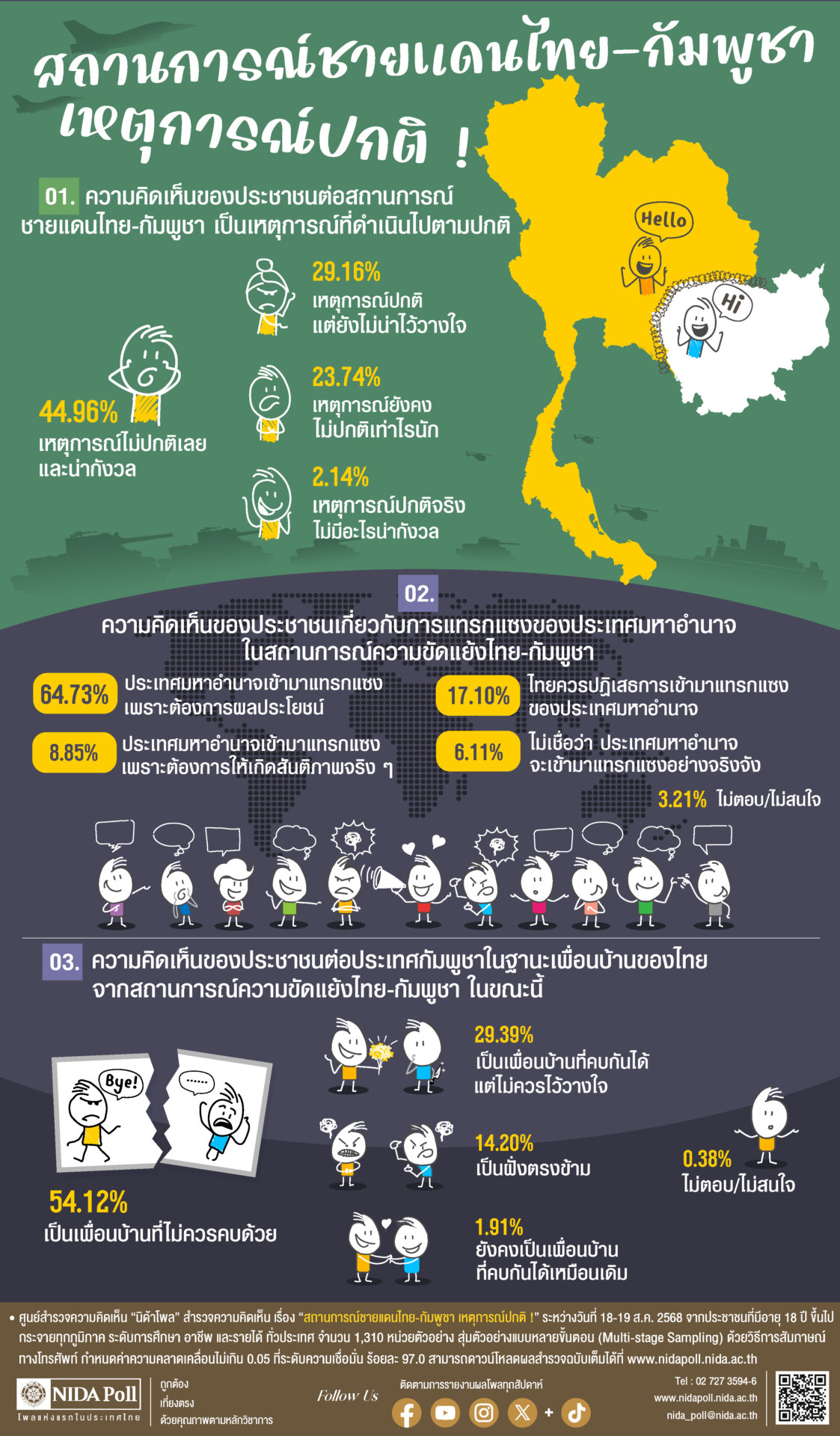 24 ส.ค. 2568 – ศูนย์สำรวจความคิดเห็น “นิด้าโพล” สถาบันบัณฑิตพัฒนบริหารศาสตร์ (นิด้า) เปิดเผยผลการสำรวจ เรื่อง “สถานการณ์ชายแดนไทย-กัมพูชา เหตุการณ์ปกติ !” ทำการสำรวจระหว่างวันที่ 18-19 สิงหาคม 2568 จากประชาชนที่มีอายุ 18 ปีขึ้นไป กระจายทุกภูมิภาค ระดับการศึกษา อาชีพ และรายได้ ทั่วประเทศ รวมจำนวนทั้งสิ้น 1,310 หน่วยตัวอย่าง เกี่ยวกับความคิดเห็นของประชาชนที่มีต่อสถานการณ์ความขัดแย้งไทย-กัมพูชา การสำรวจอาศัยการสุ่มตัวอย่างโดยใช้ความน่าจะเป็นจากบัญชีรายชื่อฐานข้อมูลตัวอย่างหลัก (Master Sample) ของ “นิด้าโพล”สุ่มตัวอย่างแบบหลายขั้นตอน (Multi-stage Sampling) เก็บข้อมูลด้วยวิธีการสัมภาษณ์ทางโทรศัพท์ โดยกำหนดค่าความคลาดเคลื่อนไม่เกิน 0.05 ที่ระดับความเชื่อมั่น ร้อยละ 97.0