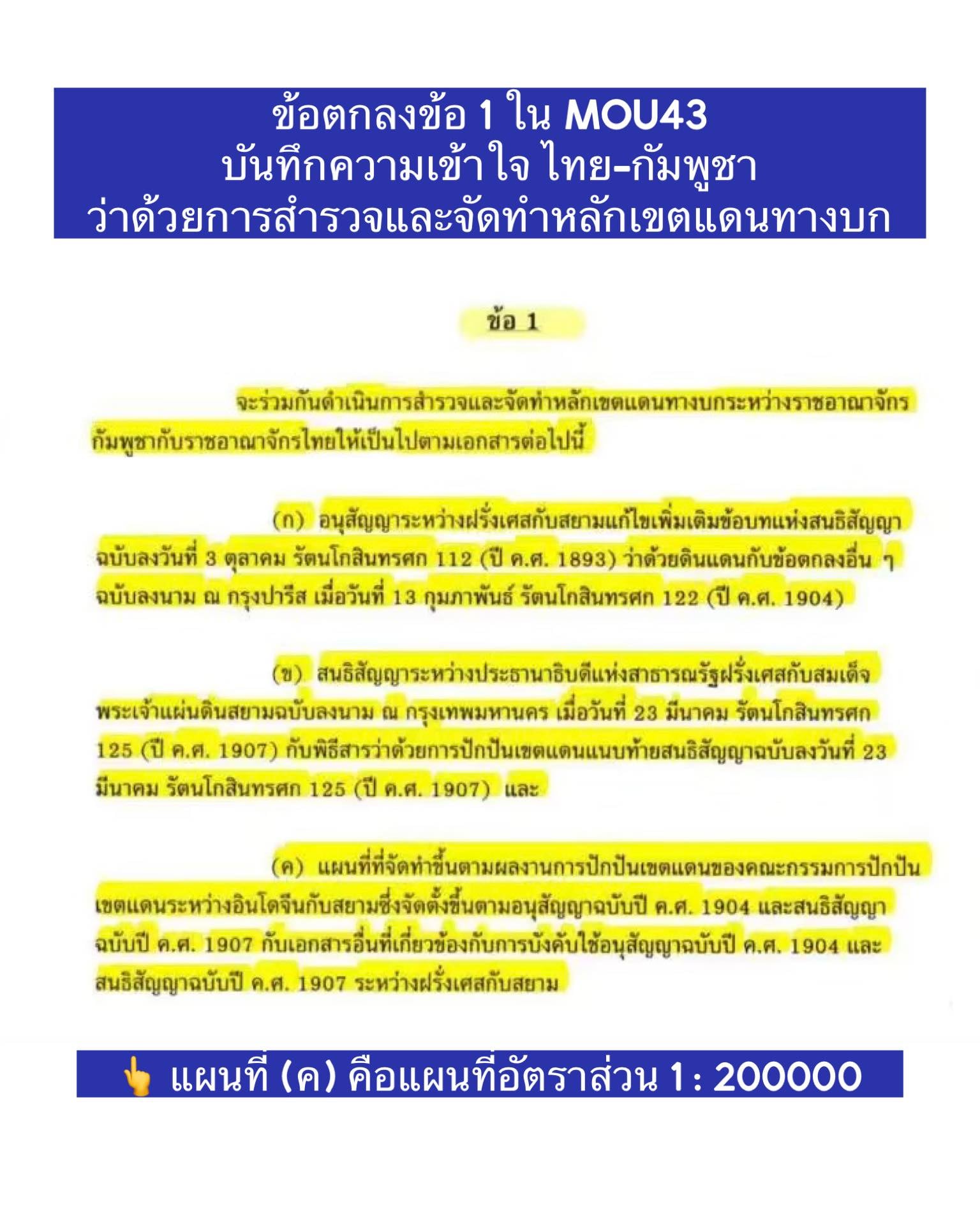 เนื่องจากในข้อ 1 ของ MOU43 นั้น มีการระบุว่าจะร่วมกันจัดทำหลักเขตแดนให้เป็นไปตามเอกสาร 3 ชุด และใน (ค) นั้น ระบุถึงแผนที่อินโดจีน-สยาม ซึ่งคือแผนที่ในอัตราส่วน 1 : 200000 ที่จะทำให้ไทยเสียเปรียบ เพราะเป็นแผนที่ที่เส้นเขตแดนของกัมพูชาอาจล้ำเข้ามาในเขตแดนที่ไทยที่ยึดถือตามแผนที่ปฏิบัติการของไทย (1 : 50000)