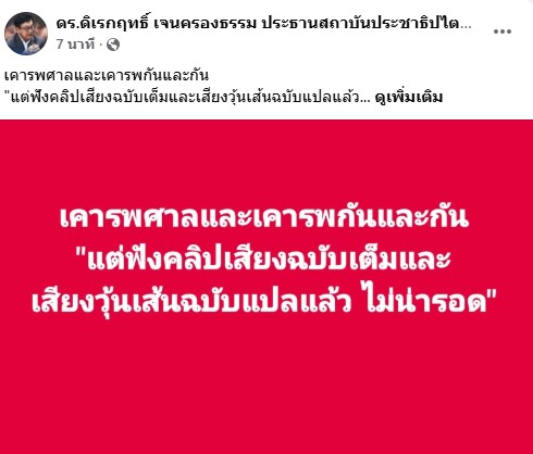 “แต่ฟังคลิปเสียงฉบับเต็มและเสียงวุ้นเส้นฉบับแปลแล้ว เป็นเรื่องประเทศชาติที่ไม่ควรไปแอบคุยกันและผมเห็นว่ามีเรื่องลับทางทหารรวมทั้งมีข้อความหารือกันแก้ปัญหาที่กองทัพไทยต้องดำเนินการตามกฎอัยการศึกด้วย”