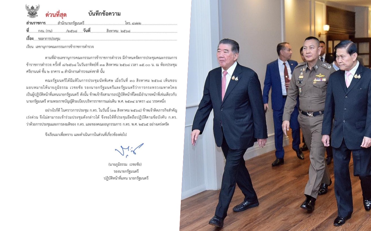 31 ส.ค.2568-นายภูมิธรรม เวชยชัย อดีตรองนายกรัฐมนตรี ปฏิบัติหน้าที่แทนนายกรัฐมนตรี ส่งหนังสือด่วนที่สุด ถึงเลขานุการคณะกรรมการข้าราชการตำรวจ ใจความว่า ตามที่ฝ่ายเลขานุการคณะกรรมการข้าราชการตำรวจ มีกำหนดจัดการประชุม คณะกรรมการข้าราชการตำรวจ ครั้งที่ 8/2568 ในวันอาทิตย์ที่ 31 สิงหาคม 2568 เวลา 15.00 น. ณ ห้องประชุม ศรียานนท์ ชั้น 2 อาคาร 1 สำนักงานตำรวจแห่งชาติ นั้น