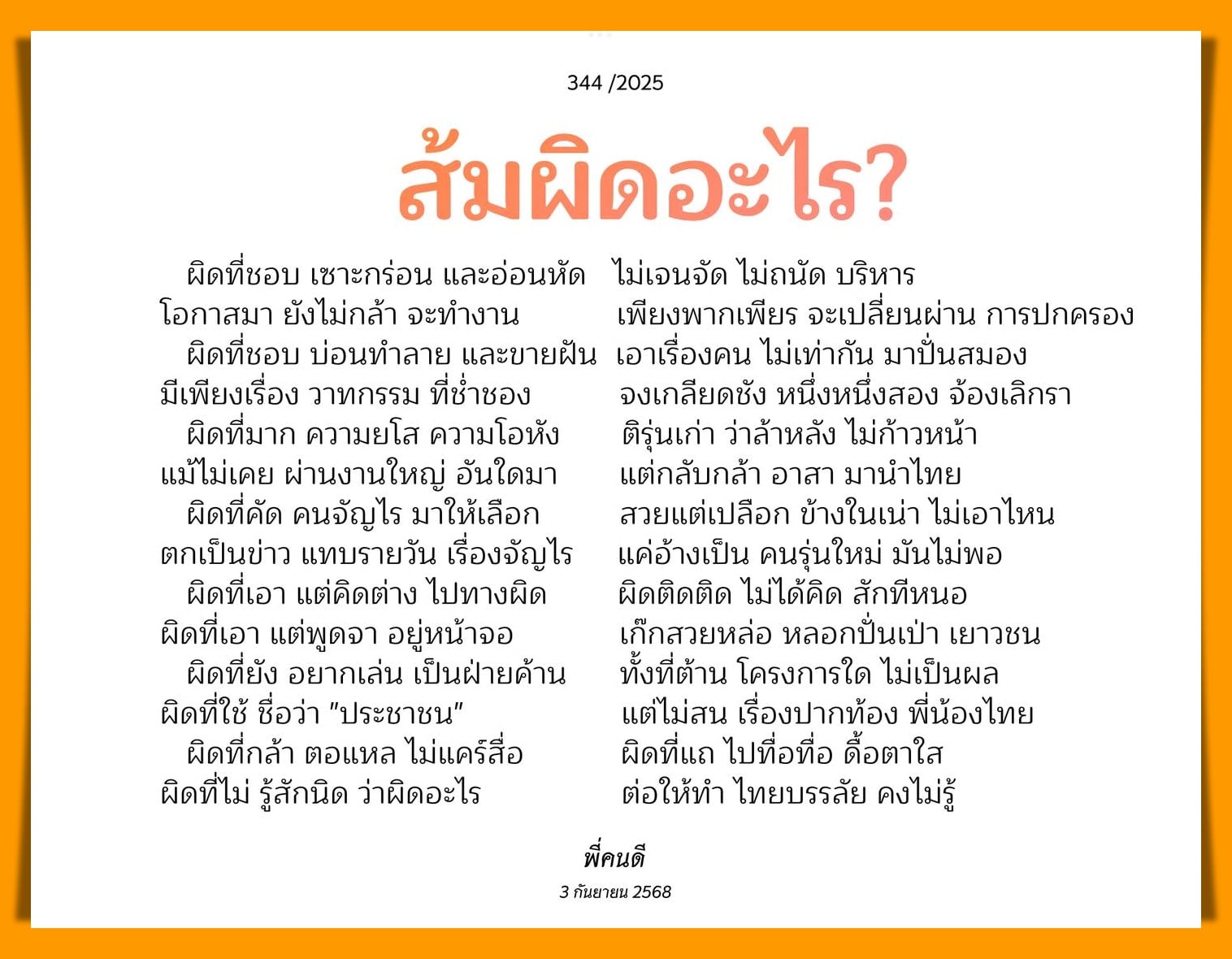 03 ก.ย.2568 – เพจ P.khondee ( พี่คนดี กวีสมัครเล่น) โพสต์ข้อความพร้อมร่ายกลอนระบุว่า ส้มผิดอะไร? เห็นน้องด้อมส้มหลายคนร้องถาม พี่เลยมาตอบให้ ขออภัยถ้าไม่ครบถ้วน